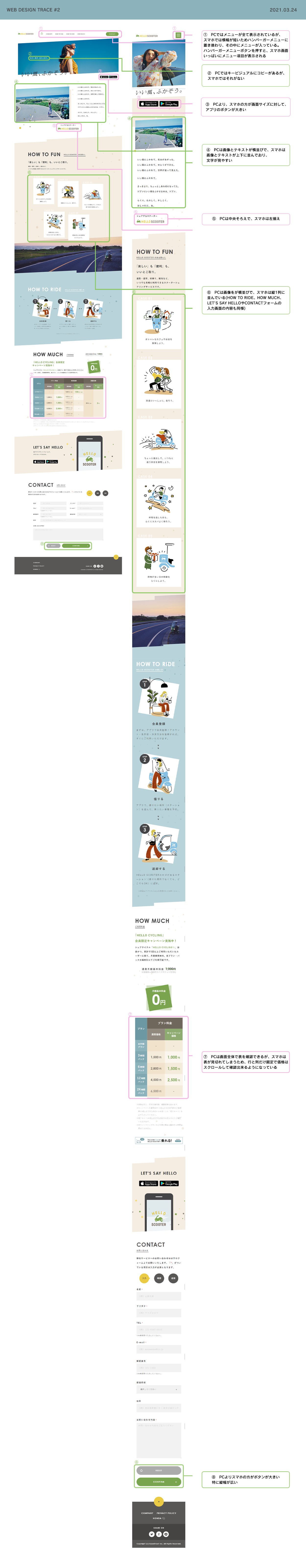 SHElikes MULTI CREATOR PROJECTの課題で、LPトレースに取組みました。HELLO SCOOTERのLPをトレースし、デザインガイドラインを制作し、PCとスマホのデザインを比較・分析してまとめました。(制作時間:30時間)