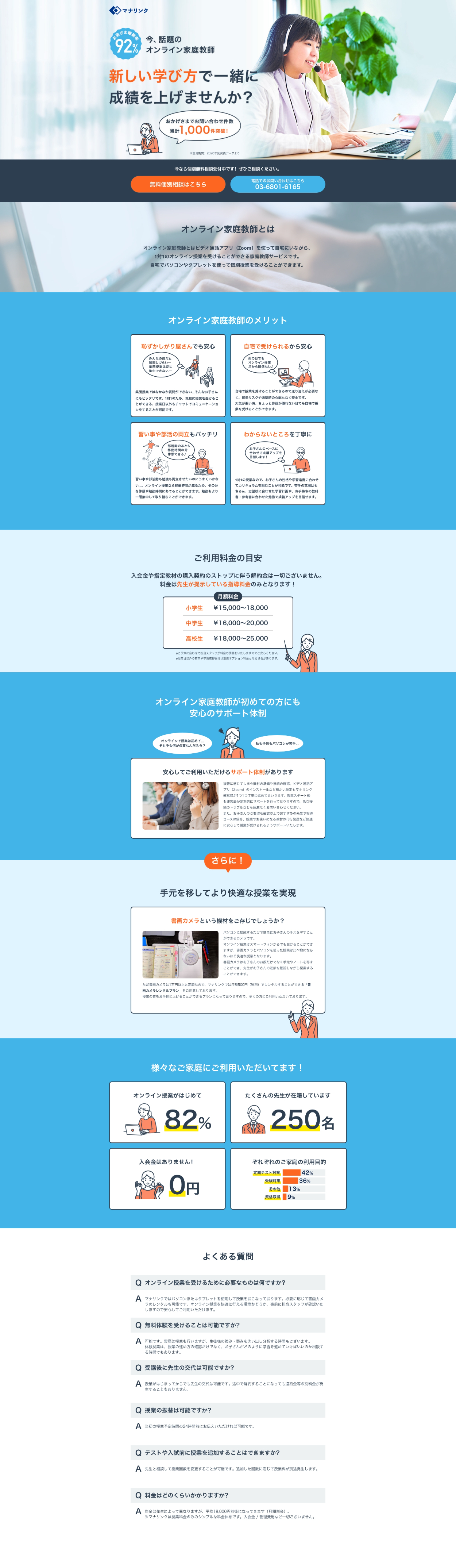 オンライン家庭教師というサービスを初めて使う「そもそもオンライン家庭教師って何?」というユーザー向けに新規LPをデザインしました。