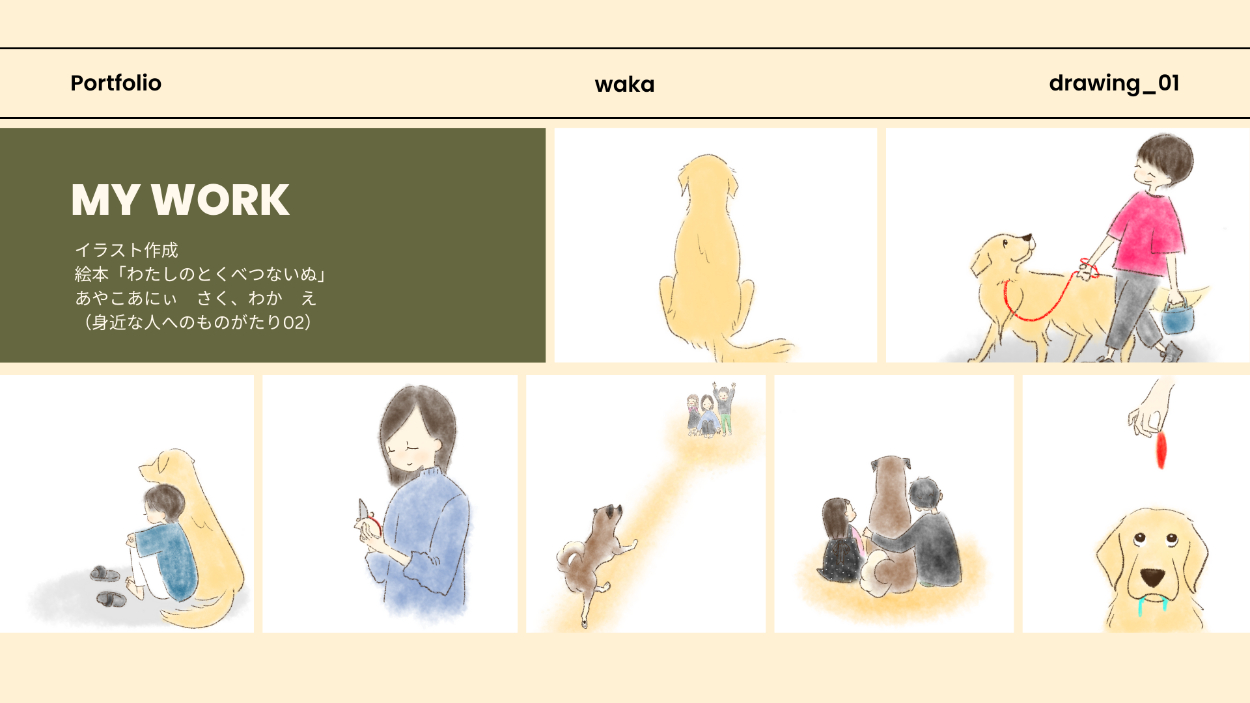 想い:ペットを飼ったことのある人なら誰でも、想起する映像が少なからずあると思い「記憶」を彷彿とさせる淡いタッチで仕上げました。