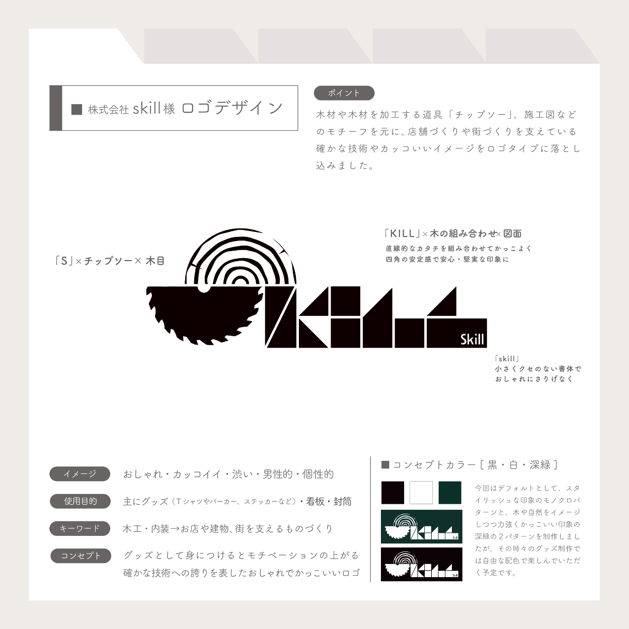 【制作実績】株式会社skilll様 ロゴデザイン KEIKO UEDA デザイナー/イラストレーター OVERVIEW 2024.10.1/制作時間:1ヶ月/制作ツール:illustrator/事業内容:店舗什器の製造販売(主に木工)/コンセプト:確かな技術への誇りを表すカッコよくておしゃれなロゴ YEAR 2024
