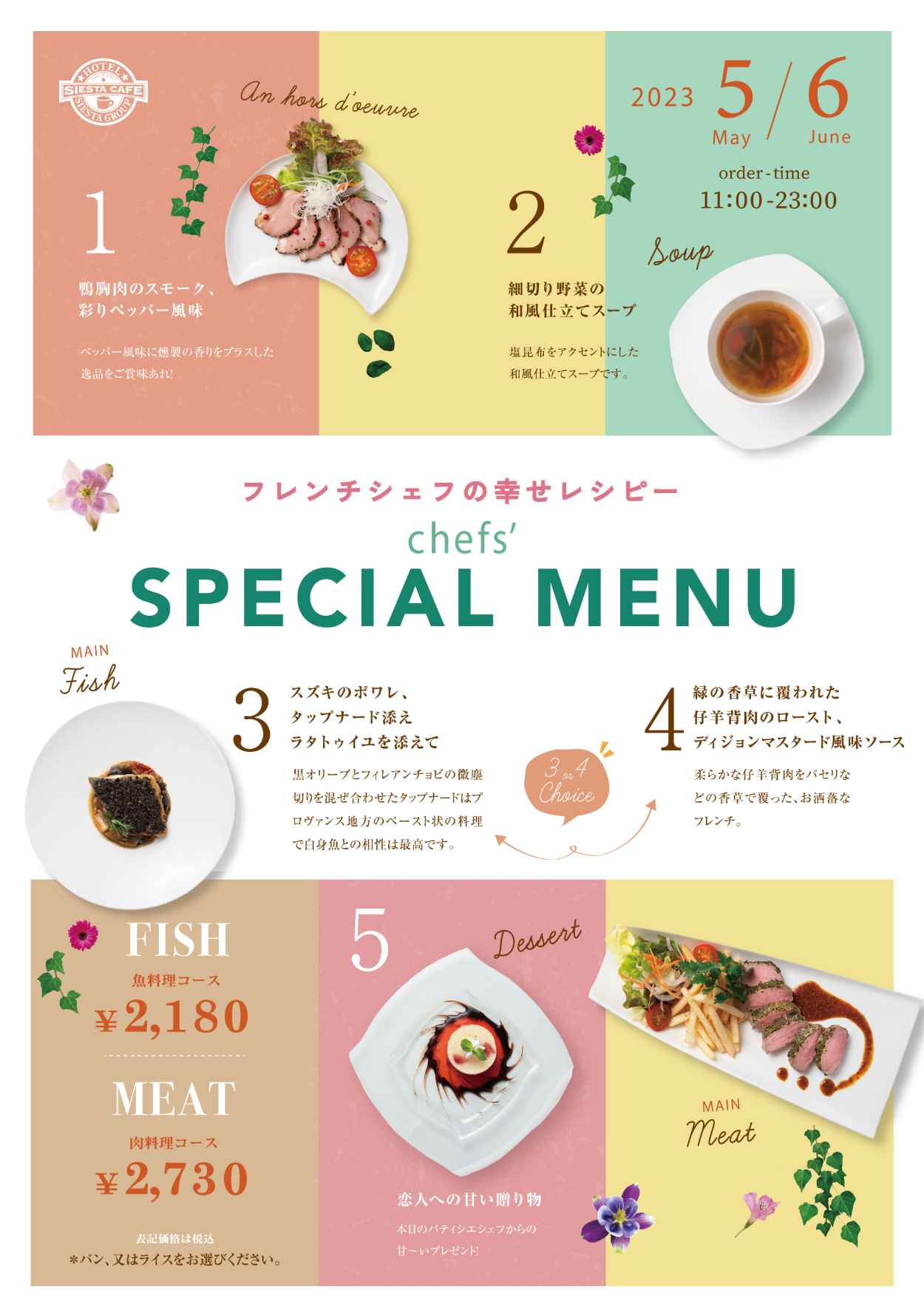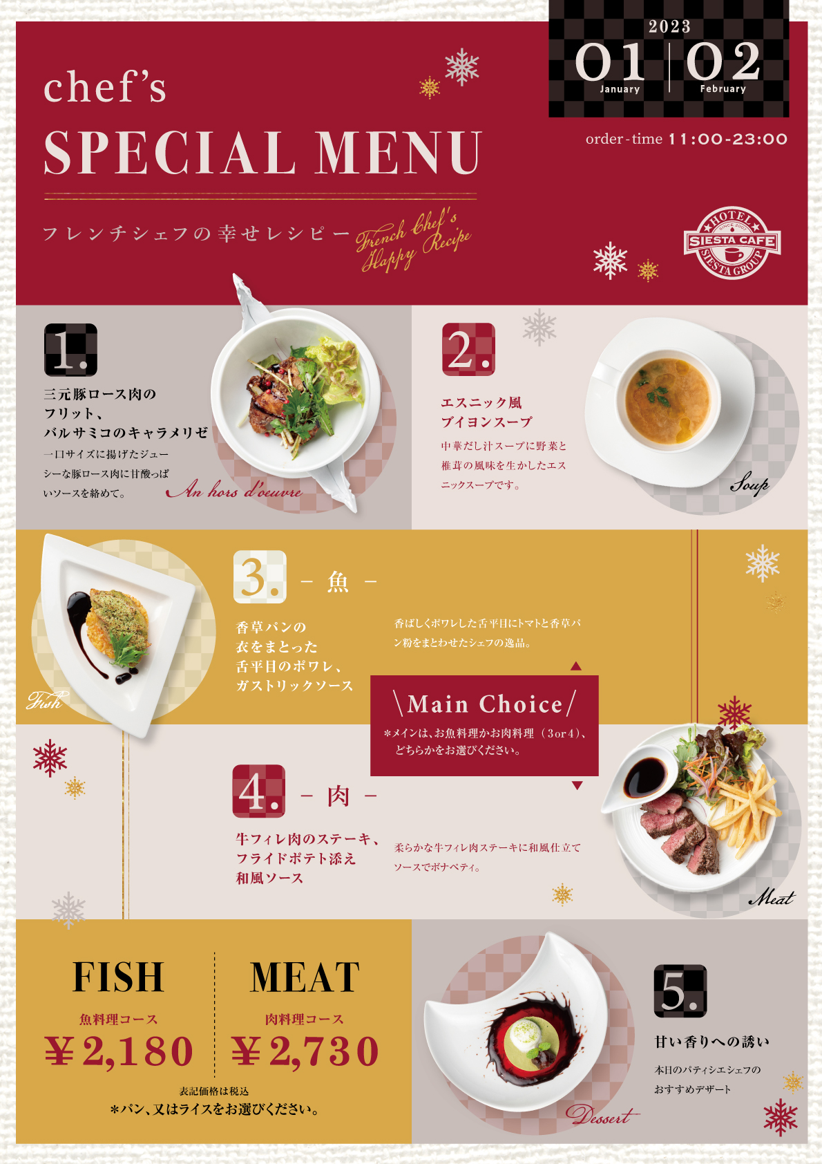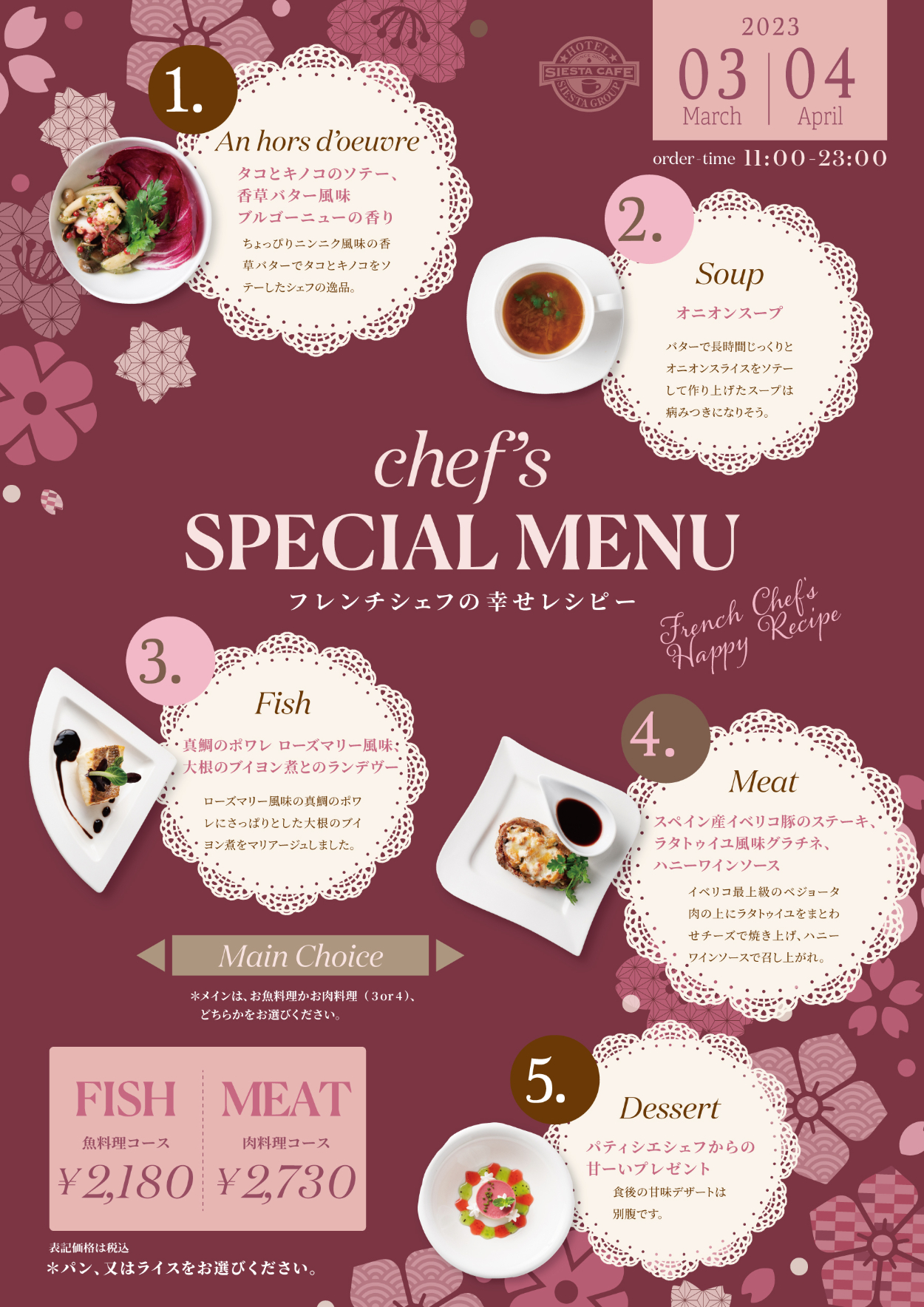 宿泊ホテルの期間限定で提供されるスペシャルメニューのPOPです。 一目みてコース内容の全貌がわかるPOPを店頭に設置することで、メニューを周知させるために制作いたしました。