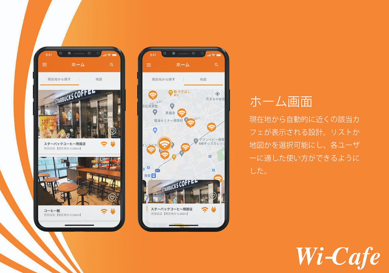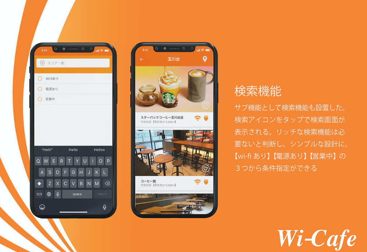 検索せずに現在地から自動的に近くの該当カフェが表示される設計。リストか地図かを選択可能にし、各々のユーザーに適した使い方ができるようにした。また移動先の場所を検索できるように、右上に検索ボタンを設ける。そもそもWI-fiと電源が設置されているカフェの数が限られているため、リッチな検索機能は必要ないと判断し、シンプルな検索機能にした。タップすればWI-FIのパスワードもわかる。アイコンは電源・Wi-Fiがあるかが色でわかるようにしている。