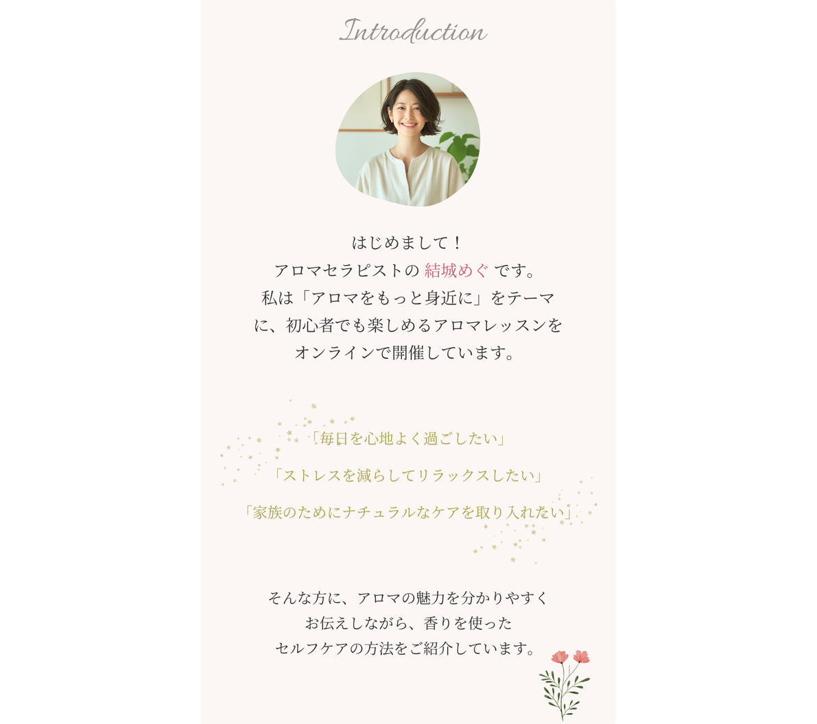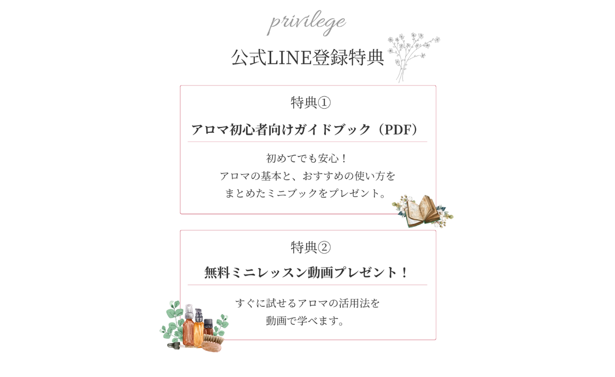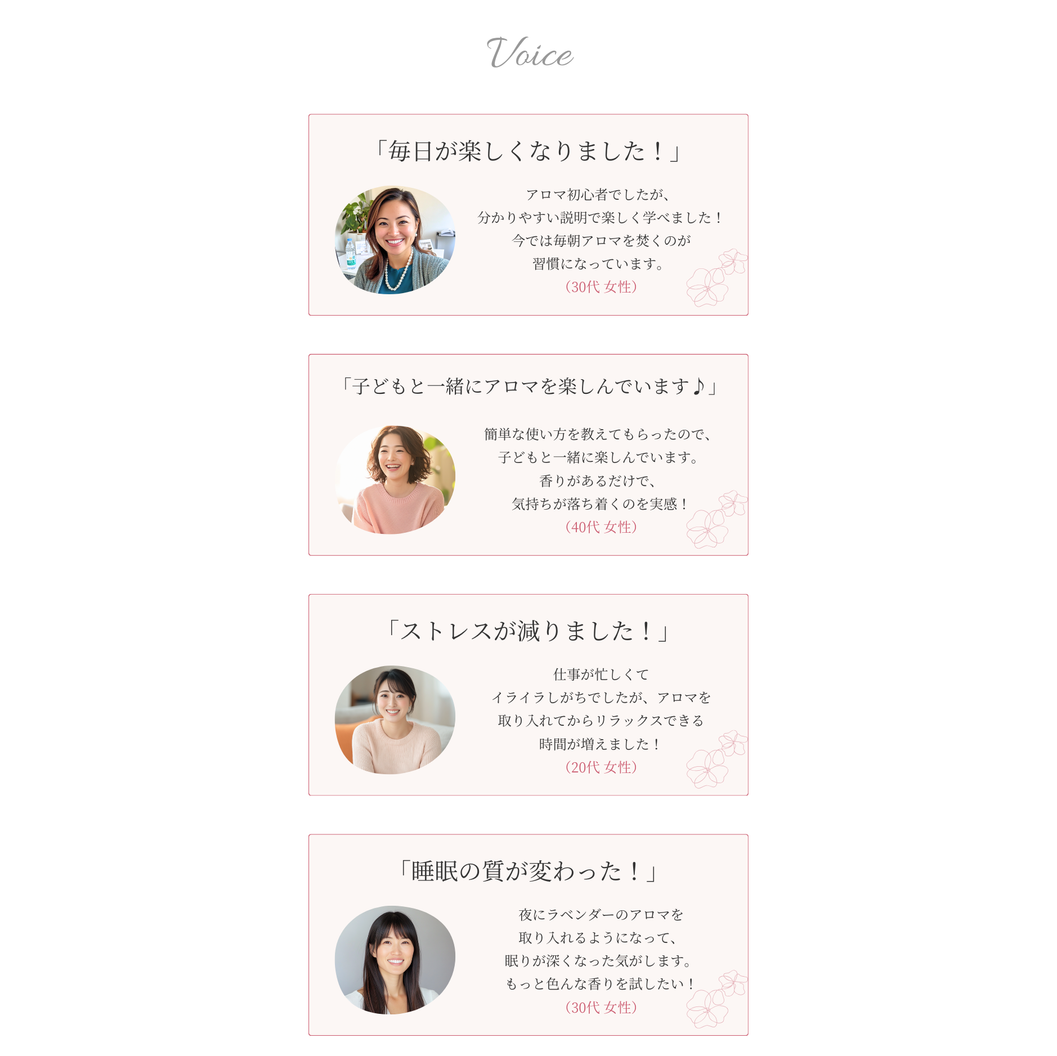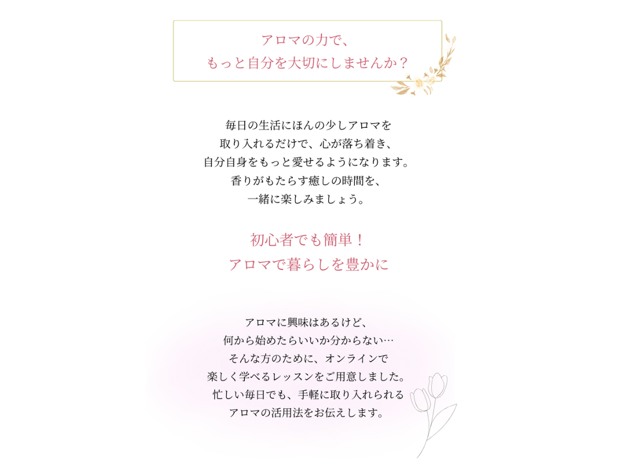 【自主制作】25〜30代の女性をターゲットにアロマサロンのLP制作を行いました。 おしゃれで、シンプルに親しみやすい印象を与えるデザインをイメージし、作成しました。