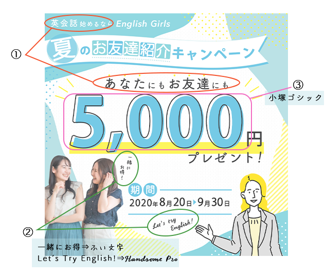 ②”Let's Try Enjoy!”や”一緒にお得!”などのセリフについては、あしらいとして筆記体や手書き風のフォントを使用し英会話らしさ、女性らしさを表現しました。