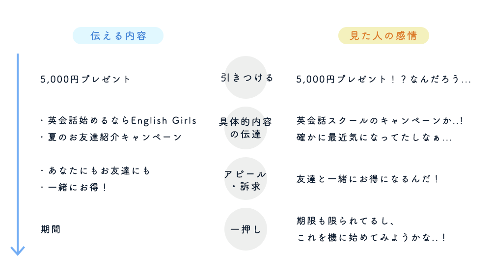 続いて、“Zの法則”で自然と視線が誘導されやすい左上に具体的な内容を記載することで、どのようなキャンペーンなのか理解してもらう構成にしています。