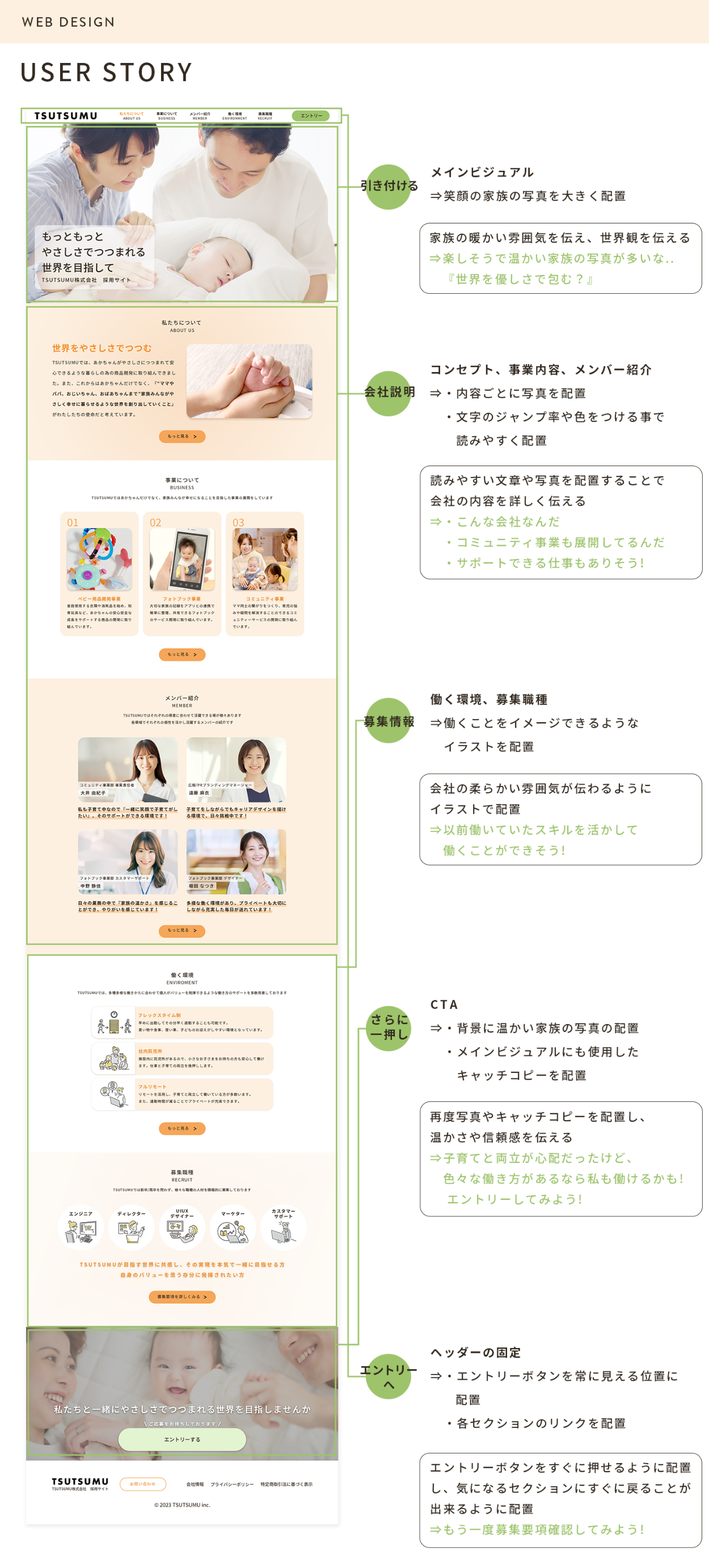 採用サイトなので内容を詳しく見る人が多いと考え、文字のジャンプ率や配色などで読みやすさを意識してデザインしました。