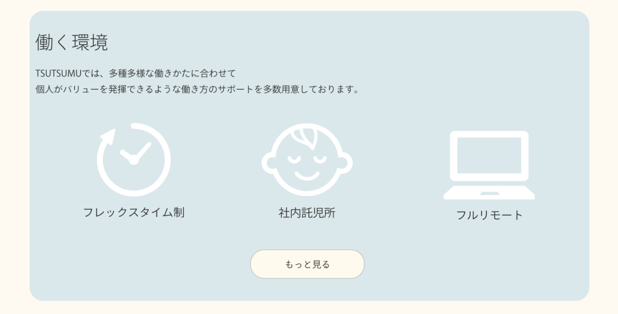 働く環境と募集職種はボタンを並べると奇数でバランスが悪く、余白の開け方や文字の大きさを意識しました。