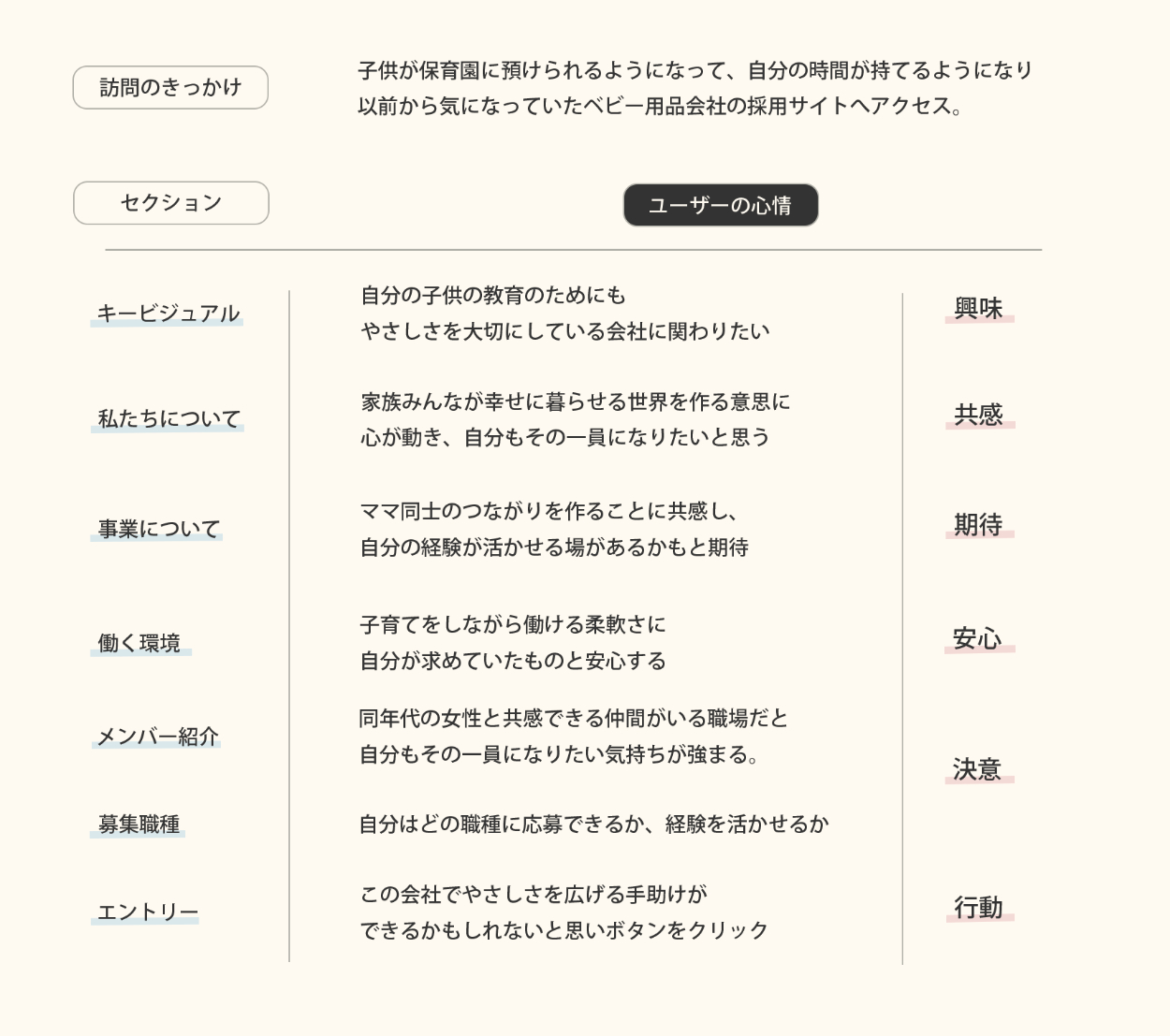 会社名ロゴと「世界をやさしさでつつむ。」がふわっと出てきて、一番目立たせたい会社名ロゴをヘッダーに持っていくことで、会社名を覚えてもらえるような動きをつけています。採用サイトなのであまり派手なアニメーションはありませんが、写真の位置が交互になるように単調にならない視覚的な動きや背景色配置を意識しました。
