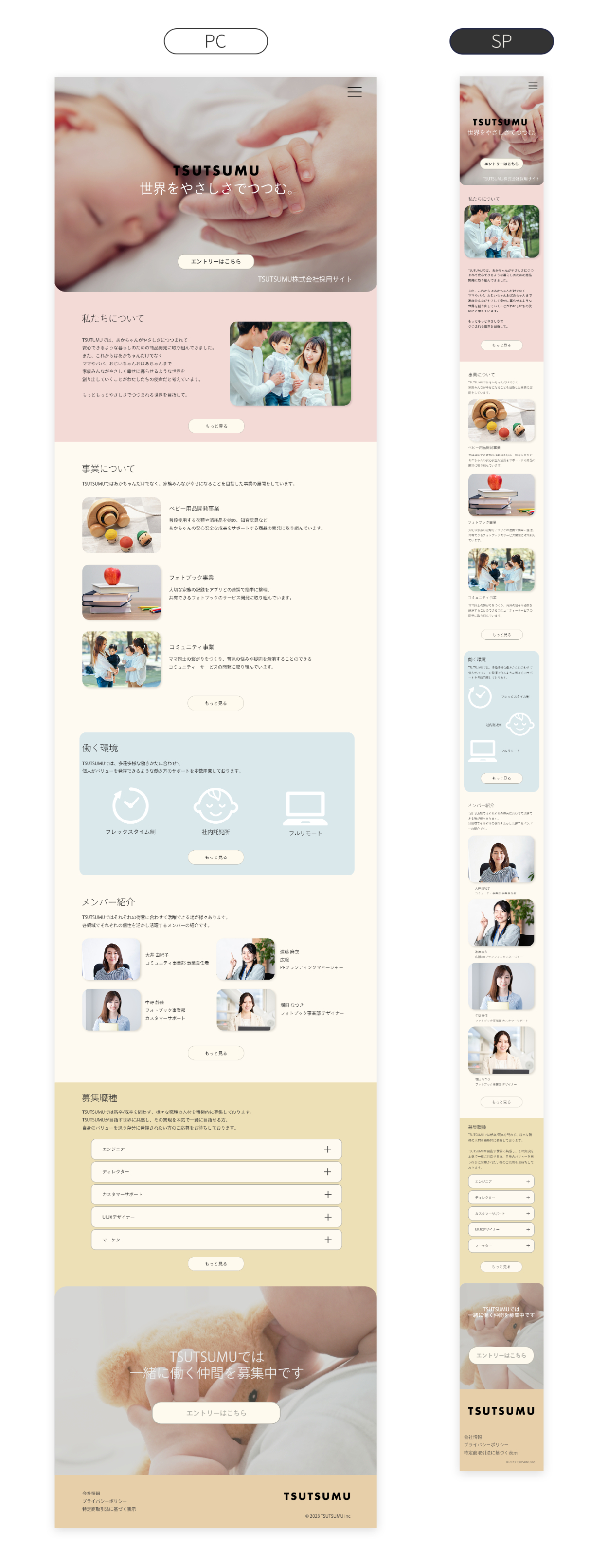 SHElikes MULTI CREATOR COURSEでの課題、ベビー用品事業等を行う企業の採用サイトの制作に取り組みました。 〔制作時間:5週間 デザイン:2週間 コーディング:3週間|使用ツール:Photoshop Visual Studio Code〕