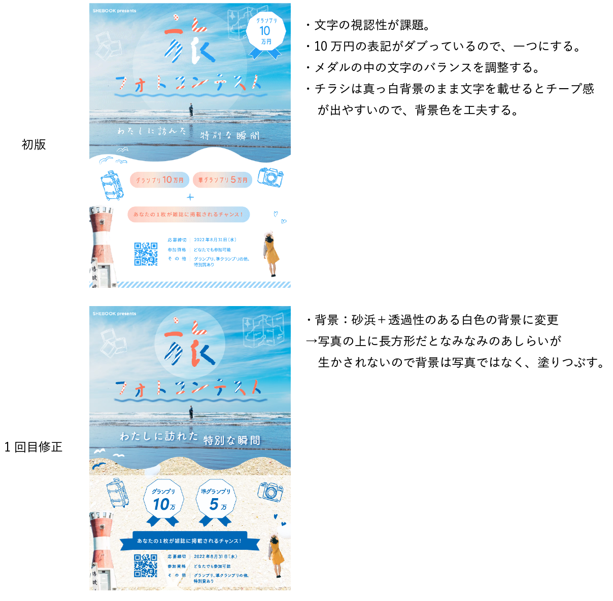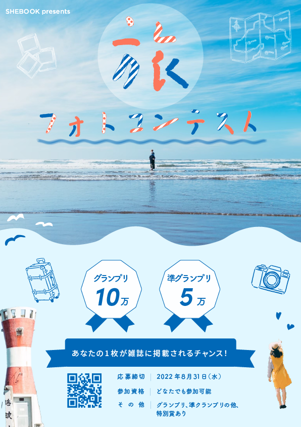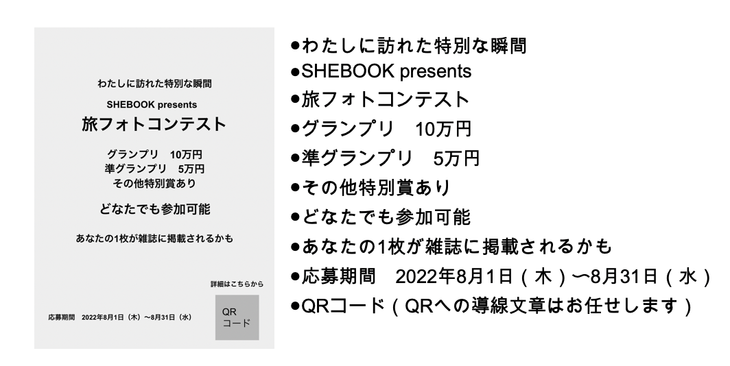 月刊SHEBOOK(架空雑誌)内で「旅フォトコンテスト」と名したフォトコンテスト(架空案件)実施にあたり、コンテスト参加者を募るフライヤー制作を募集。