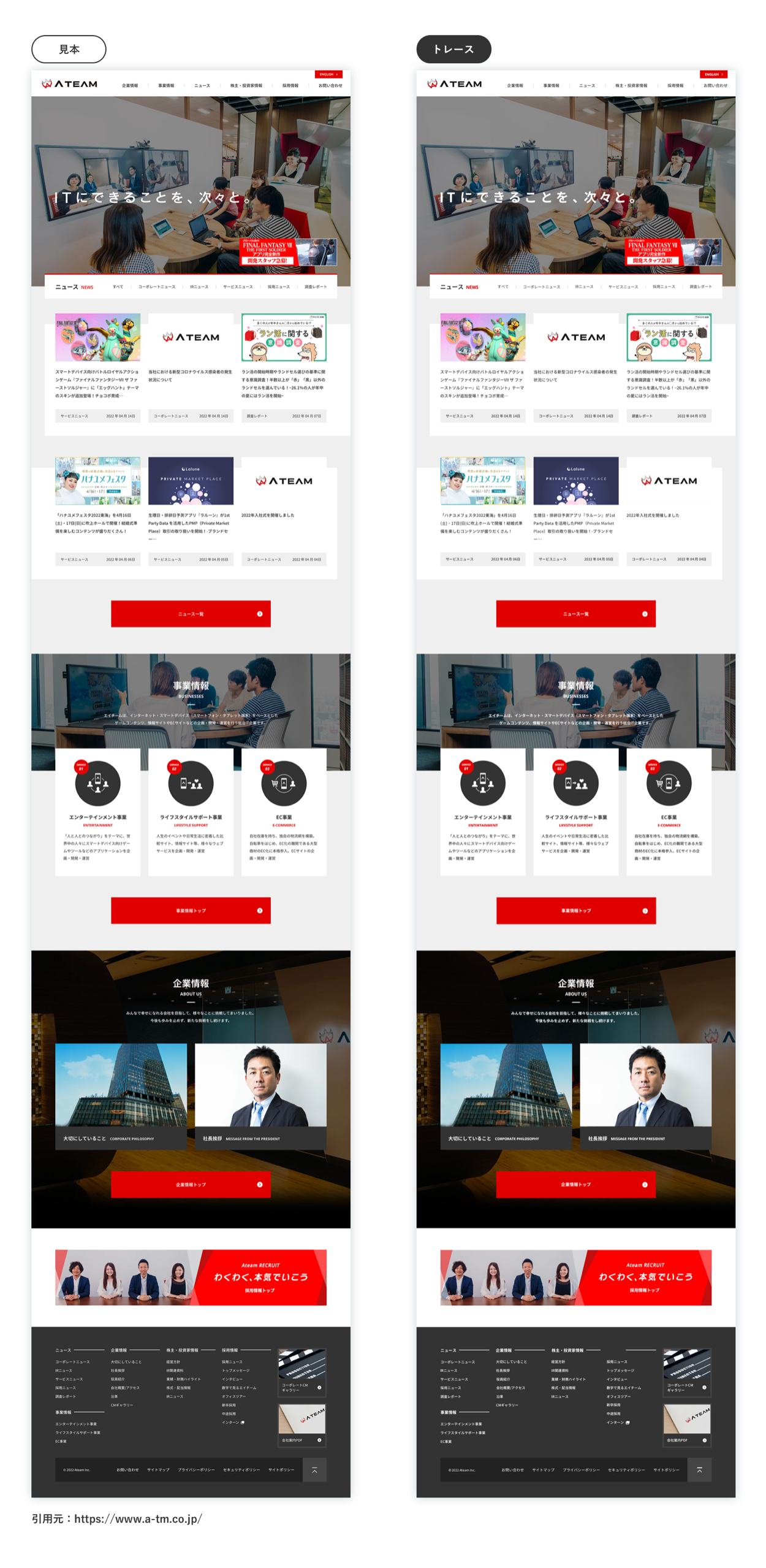 見本を横と下敷きに配置しピクセル単位でズレがないよう、コンテンツの大きさや写真のクリッピングマスク等、かなり細かく調整しながらトレースを行いました。
