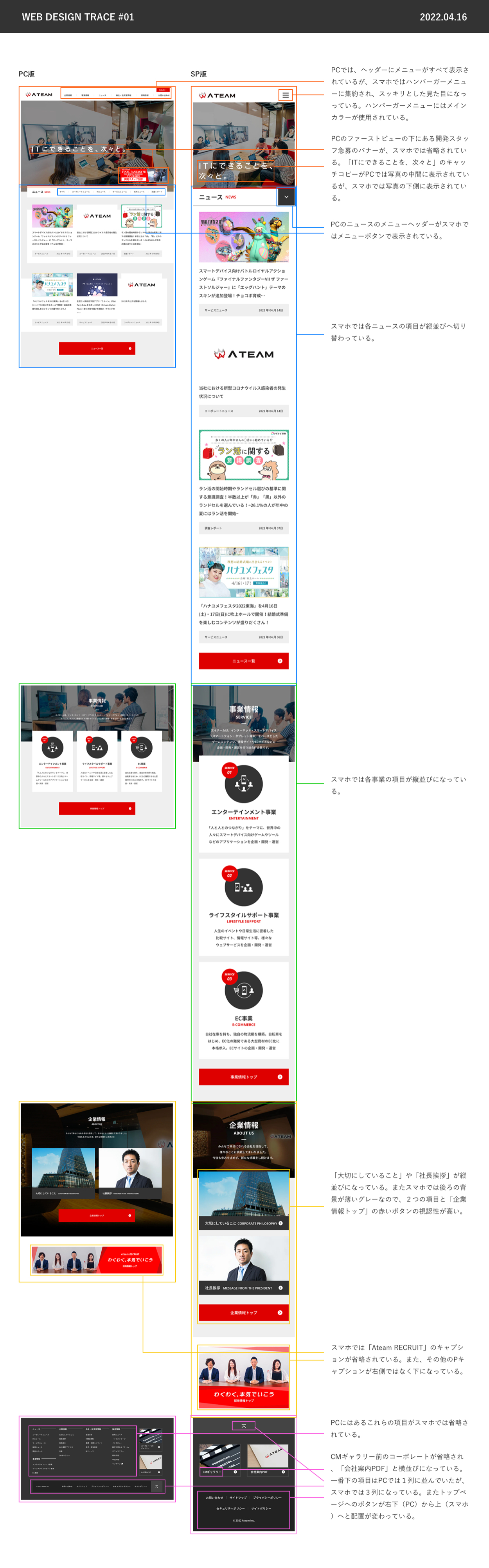 SHElikes MULTI CREATOR PROJECTにて、WEBページトレース課題に取り組みました。デザインガイドラインの作成と、PCとスマホで異なるデザインやレイアウトの分析を行い、分析結果をまとめました。(所要時間:約15時間)