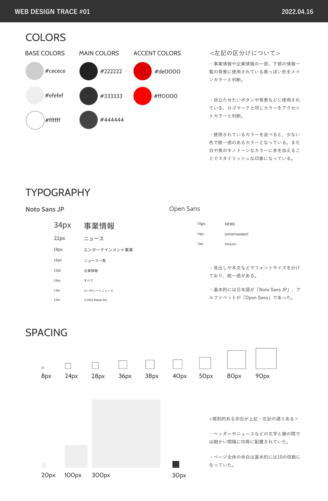 トレースを行いながら、タイトルや説明文などによるフォントサイズの違いを分析しつつ、各セクション間や文章間の余白もどれくらい取られているのか、感覚を掴みながら取り組みました。