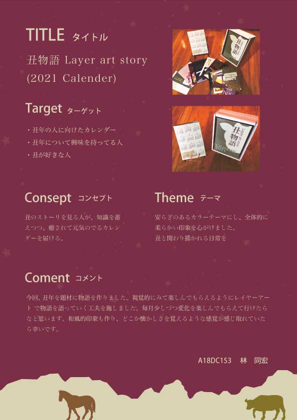 今回課題の一貫で卓上カレンダーを制作しました。ターゲットからコンセプトの設定まで、自主的に設定した上で実物の完成を手掛けました。