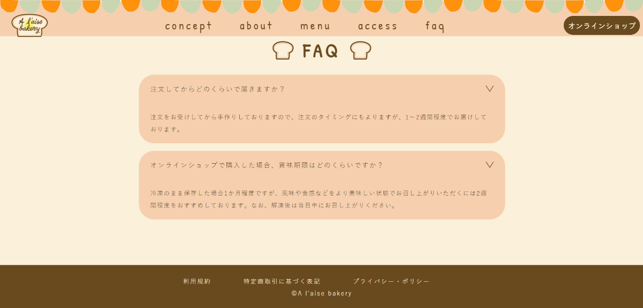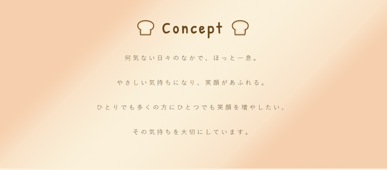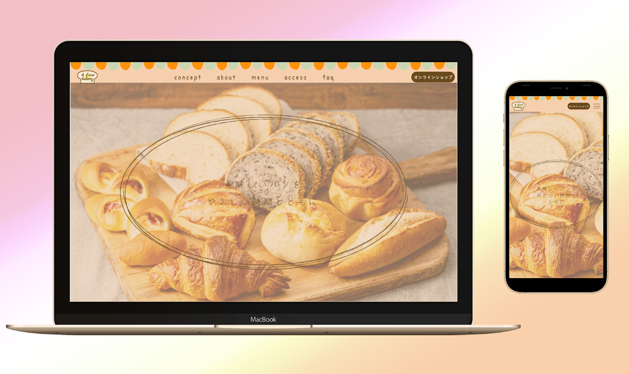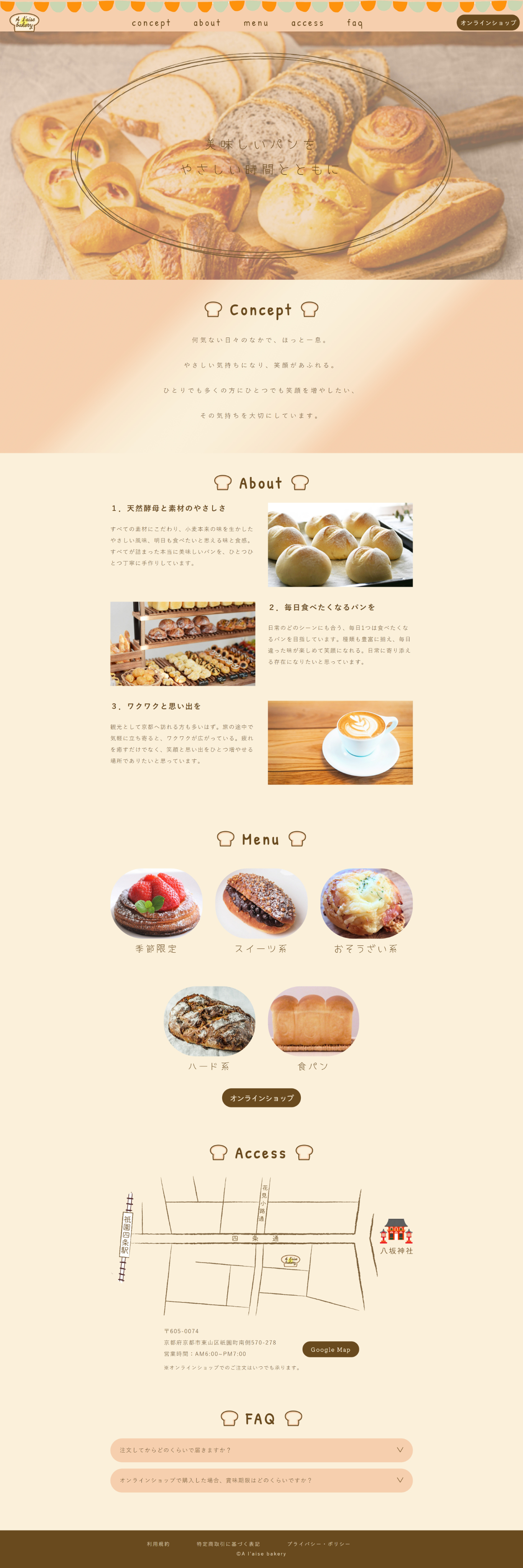 「美味しいパンを、やさしい時間とともに」というキャッチコピーとともに、サイト全体を通して暖色系のカラーを使用し、親しみやすいフォントを選び制作。