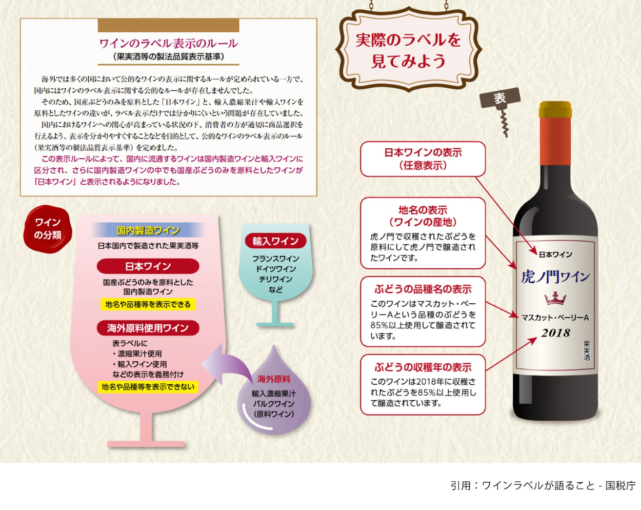 まず、酒類は法律があるためその部分を遵守しなければいけません。日本ワインの場合、「日本ワインの表示」「産地の表示」「ぶどうの品種名の表示」「ぶどうの収穫年の表示」の4点を謳うことができるため取り入れます。(条件クリアの前提)