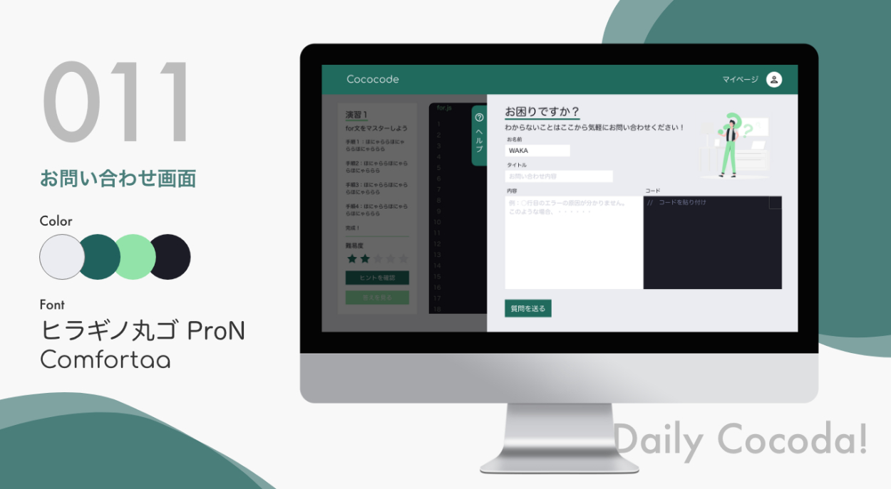 Progateのようなサービスを想定して、悩んだ時に右のヘルプタブから質問を送れるような設計にしました。質問内容を説明する欄とコードを貼り付ける欄を用意しています。