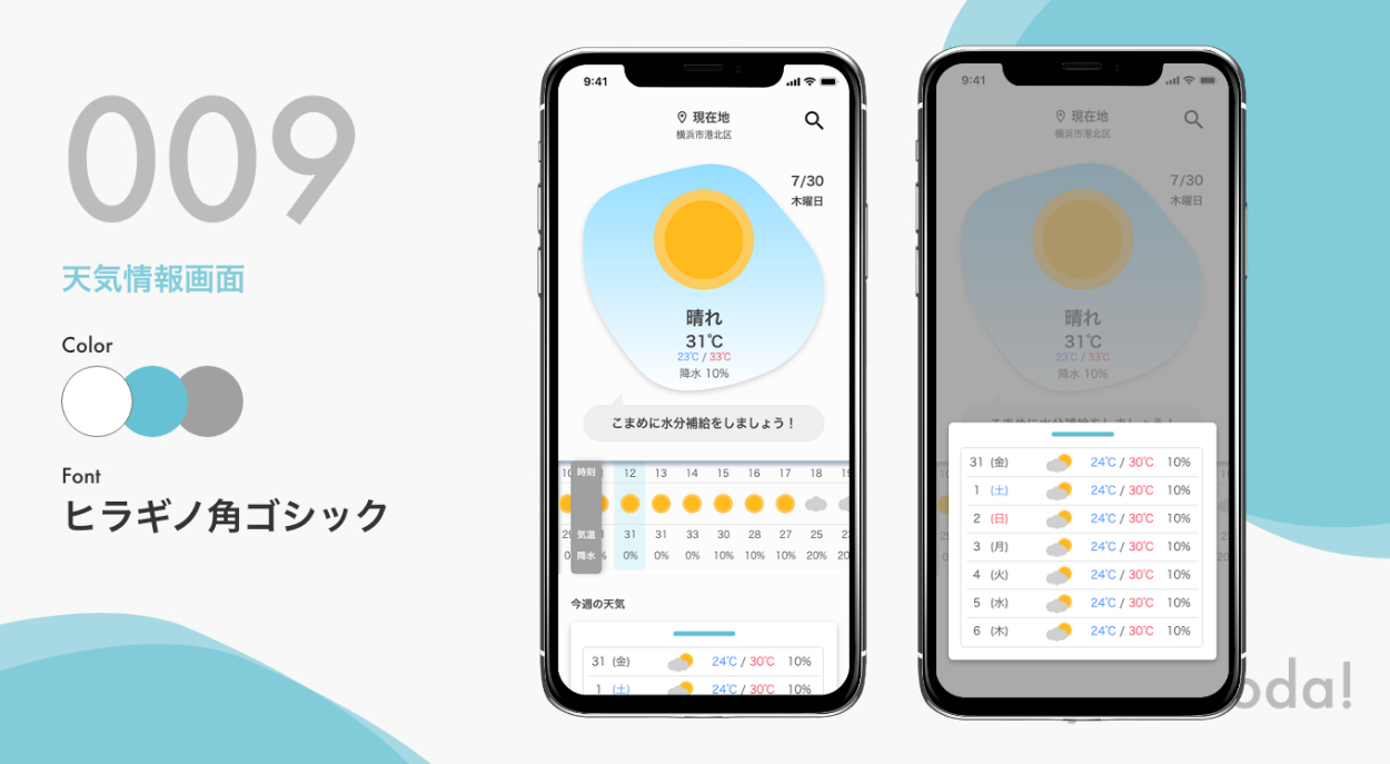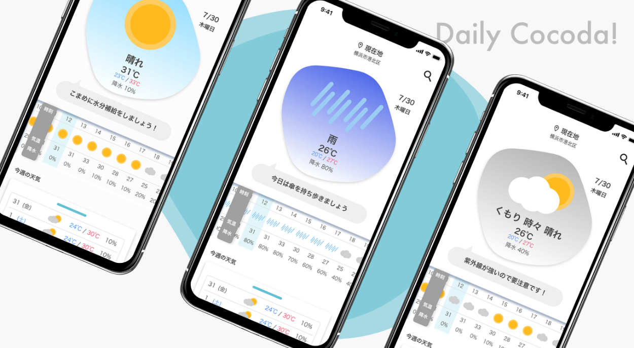 忙しいビジネスマンのために、「こまめに水分補給をしましょう!」のような一言アドバイスが表示されるようにしました。時間がなくても、出かける前にパッと見て必要な情報を得られるよう意識しています。情報の優先順位を考えて、週間の天気はスワイプで出てくるような設計にしました。