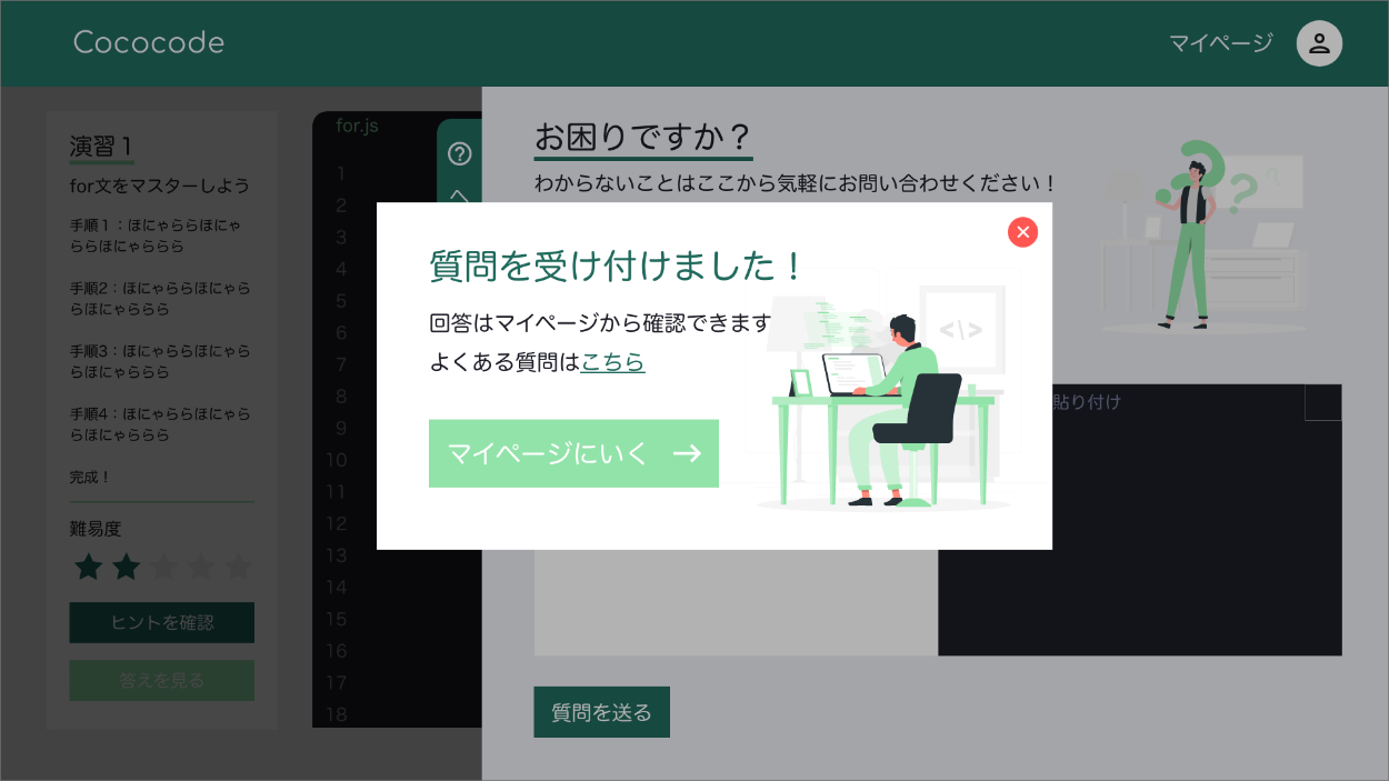 プログラミング初心者だと、「このエラーは、なんて聞いたらいいかわからない」「一度の返答じゃわからなかった」と言う悩みが多いと思うので、マイページのヘルプ欄はスレッド式で実装し、同じヘルプに対して繰り返しQ&Aができるような機能を想定しています。(今回は質問を受けた時のポップアップまでデザインしました。)