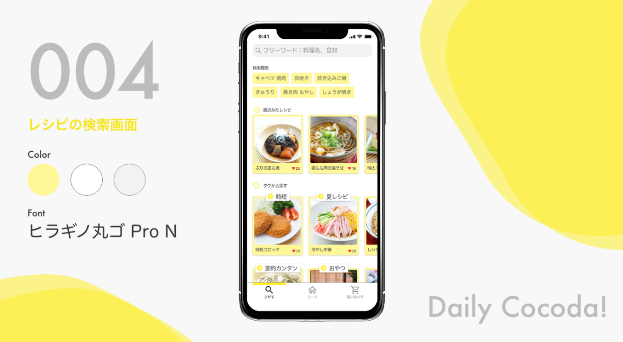検索履歴と、最近見たレシピ、そしてタグから検索できるような画面にしました。