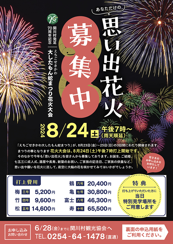 竹と藁で作られた長さ82.8メートルの大蛇が村を練り歩くお祭りの前夜祭で行われる花火大会。人口5千人の村で温かい雰囲気で行われる花火大会に気軽に応募できるよう、可愛い蛇と大きめの文字で親しみやすいデザインにしました。
