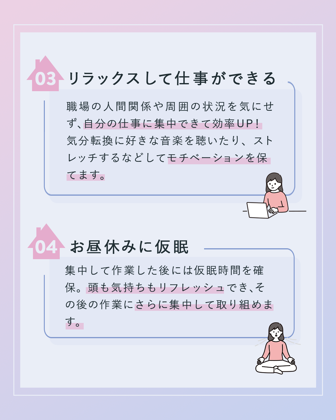 「心と体がラクになる!在宅勤務のメリット6選」をテーマにしたSNSバナーコンペに応募しました。コンテンツの内容、構成、デザイン等自分で制作しました。 【使用ツール】Photoshop