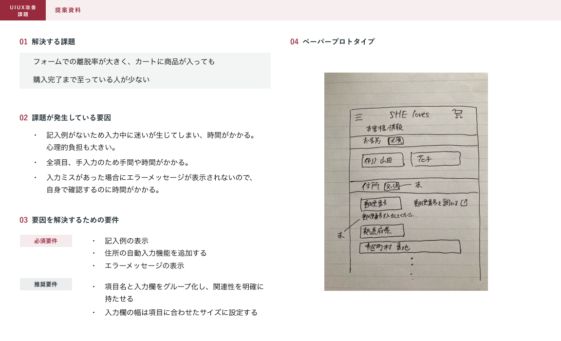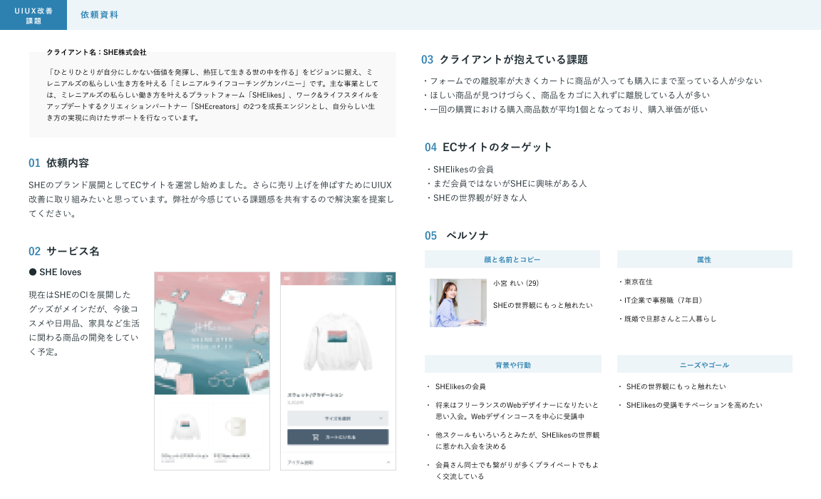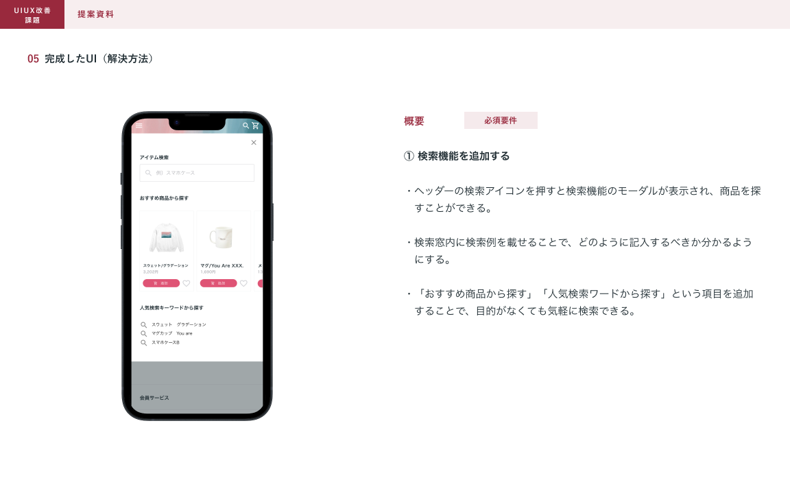 顧客の購買体験を良くするとともに売り上げを伸ばすことを目的として、既存のデザインルールに従い、UIUX改善に取り組む。解決案を提案資料として作成する(3つの課題の中から2つ選び、改善提案を行う)。