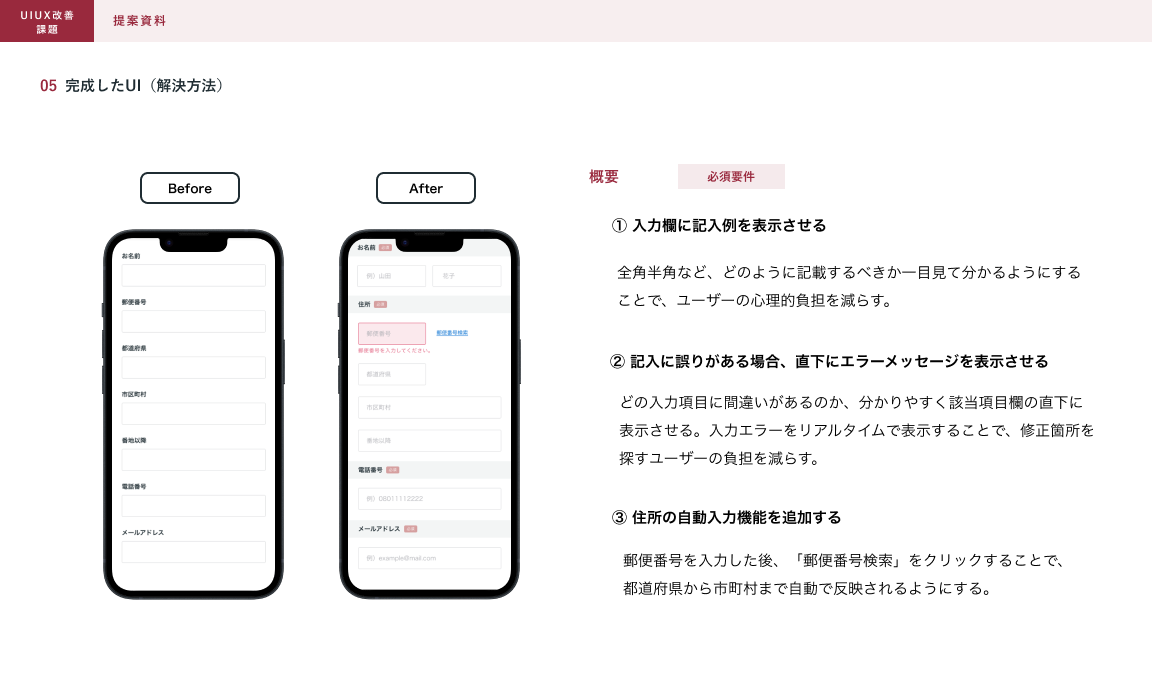 入力例や郵便番号の自動入力機能を追加することで、どのように入力すればいいのか迷わないよう工夫しました。また、入力ミスがあった場合は、入力直後にエラーメッセージを表示することで、修正箇所を探すユーザーの負担を削減しました。