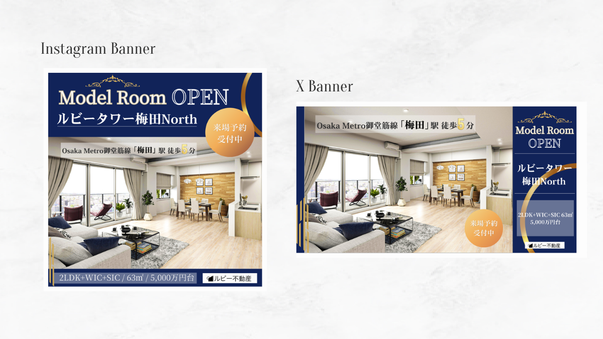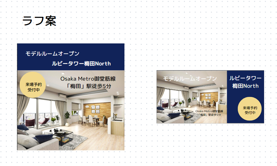 【架空案件】オンラインスクールHer Techの課題 分譲マンションのモデルルームオープン告知バナーの作成 ・所要時間 ラフ案作成85分 バナー作成時間90分 ・使用ツール Canva