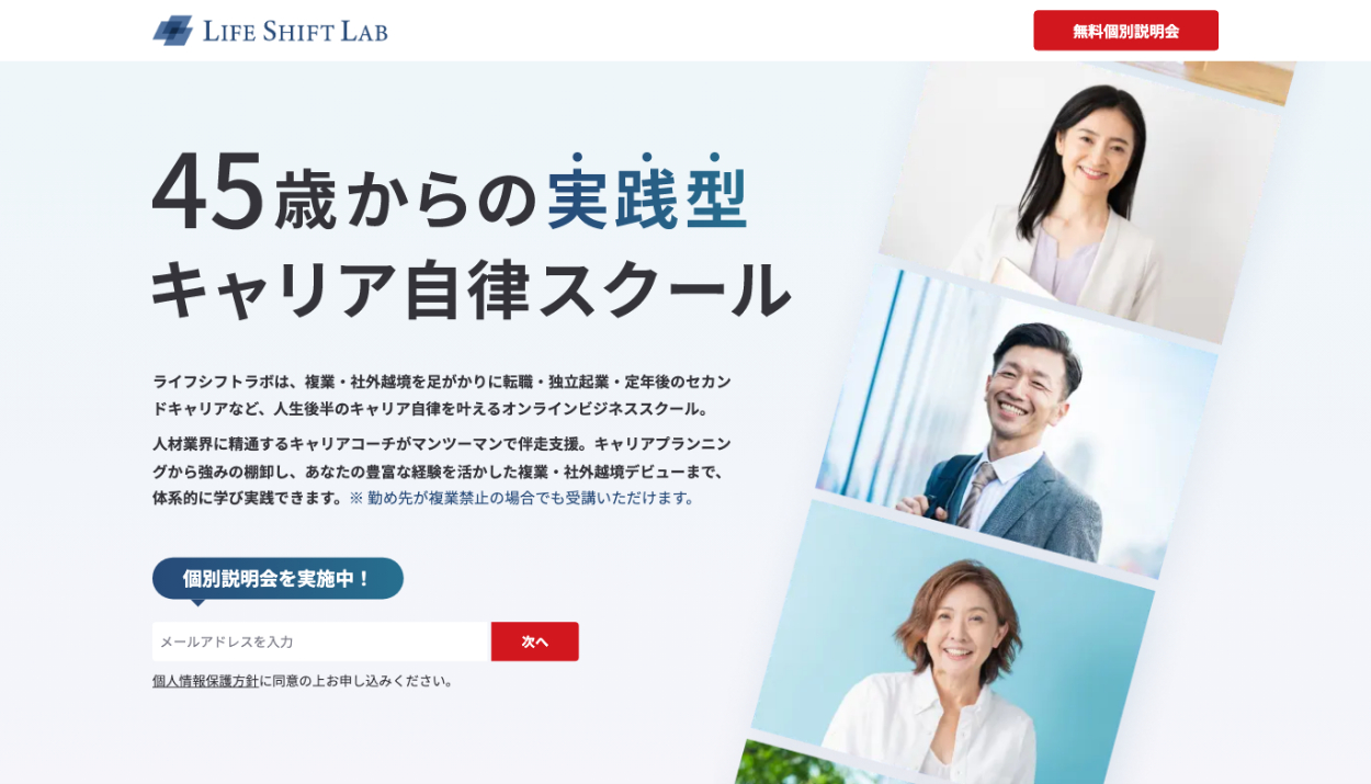 45歳以上の方をターゲットにした、実践型キャリア自律スクール「ライフシフトラボ」のLPデザインを担当しました。より多くの方へ届けるため、ユーザー様のお声を元に随時ブラッシュアップをしています。