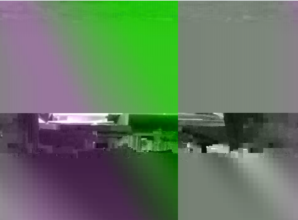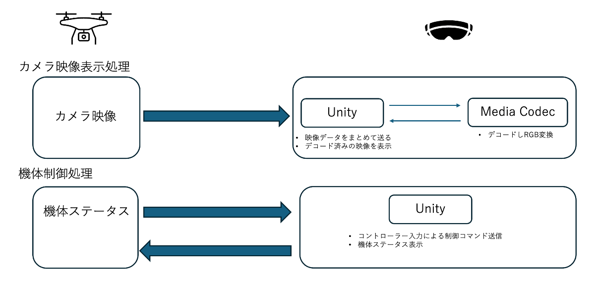 Telloは特定のポートにコマンドを送ればその通りに動く仕組みのため、コントローラによる操作はすぐにできたが、カメラ映像をVRHMDに表示する処理に大変苦しんだ。Tello公式が提供するサンプルスクリプトはPythonで作られたもので、描画処理にはOpenCVを使用していたが、Unityにはリアルタイムにデコードし描画するアセットが存在しなかった。そのため、デコードおよび描画の処理を自作する必要が生じた。そこでAndroidAPIのMedia Codecに目をつけ、プラグインを製作した。しかし、仮想空間に表示された映像は崩れていたり色ずれが起きていた。この問題の原因は7分割して送られてくる映像データを誤った分割数でデコード処理していたことであった。Wire Sharkを使用してTelloから送られてくるデータを解析することで判明した。