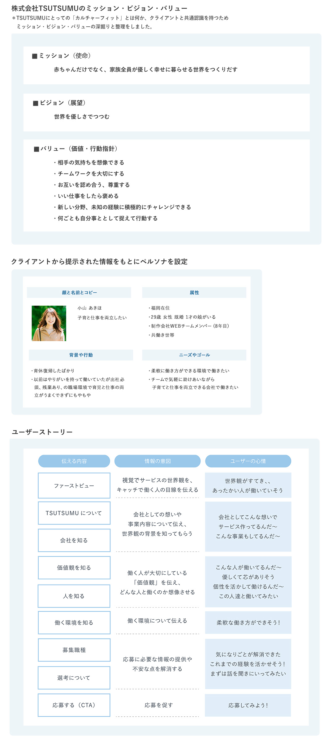 クライアントから提示された情報をもとに、自分なりに株式会社TSUTSUMUの「ミッション・ビジョン・バリュー」「ペルソナ」「ユーザーストーリー」を考えました。