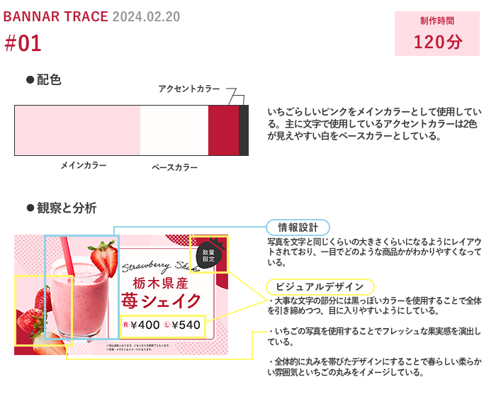 SHElikes MULTI CREATOR COURSE受講中に、バナートレースの課題にて制作。 制作されたバナーのターゲットや目的を考えながらトレースし、分析結果をまとめました。(使用ツール:Photoshop)
