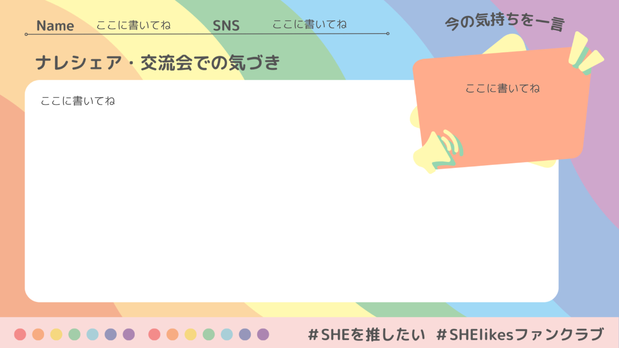 サポート隊によるSHEの推しポイントのナレシェア、また交流会に参加して感じた気づきなどをメモするのに使うため