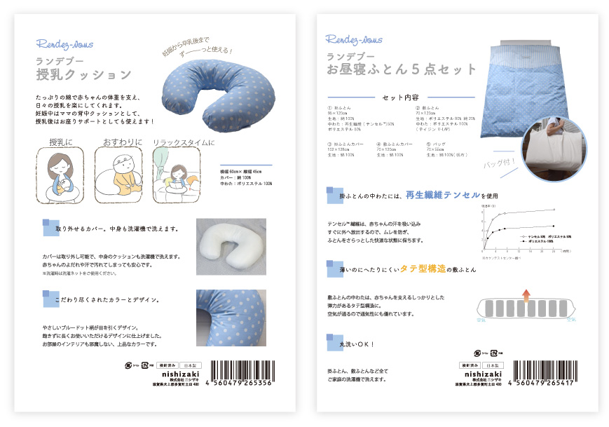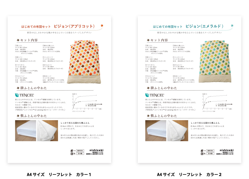 この商品のリーフレットの場合は、布団のデザインのイメージと合わせるように、モチーフの鳥のイラストを色んな場所に配置したり、ブランドのイメージに合わせた游明朝のフォントを使用するなどしました。