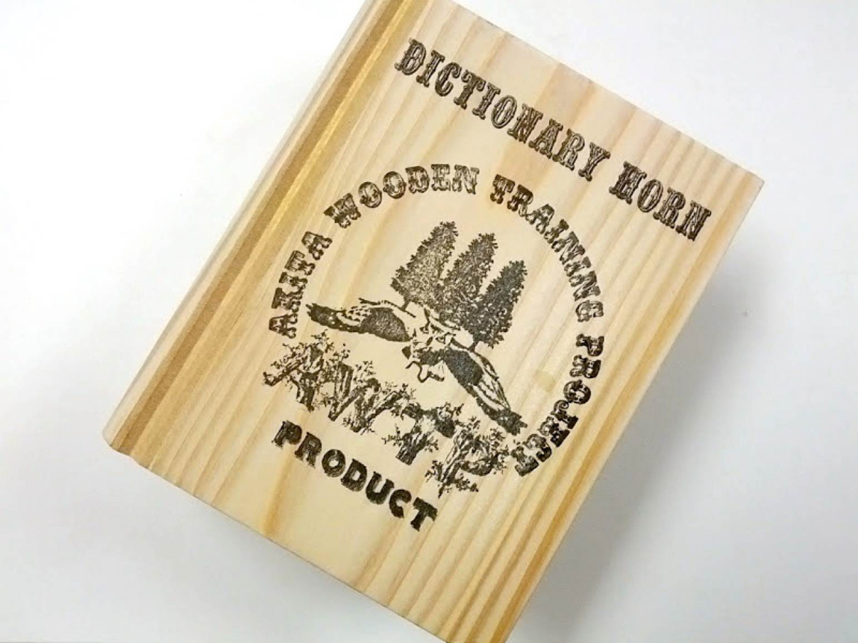 室内のインテリアに溶け込むようデザインされた辞書型スピーカー。本体の構造は蓄音機のラッパ型ホーンと同じ構造。