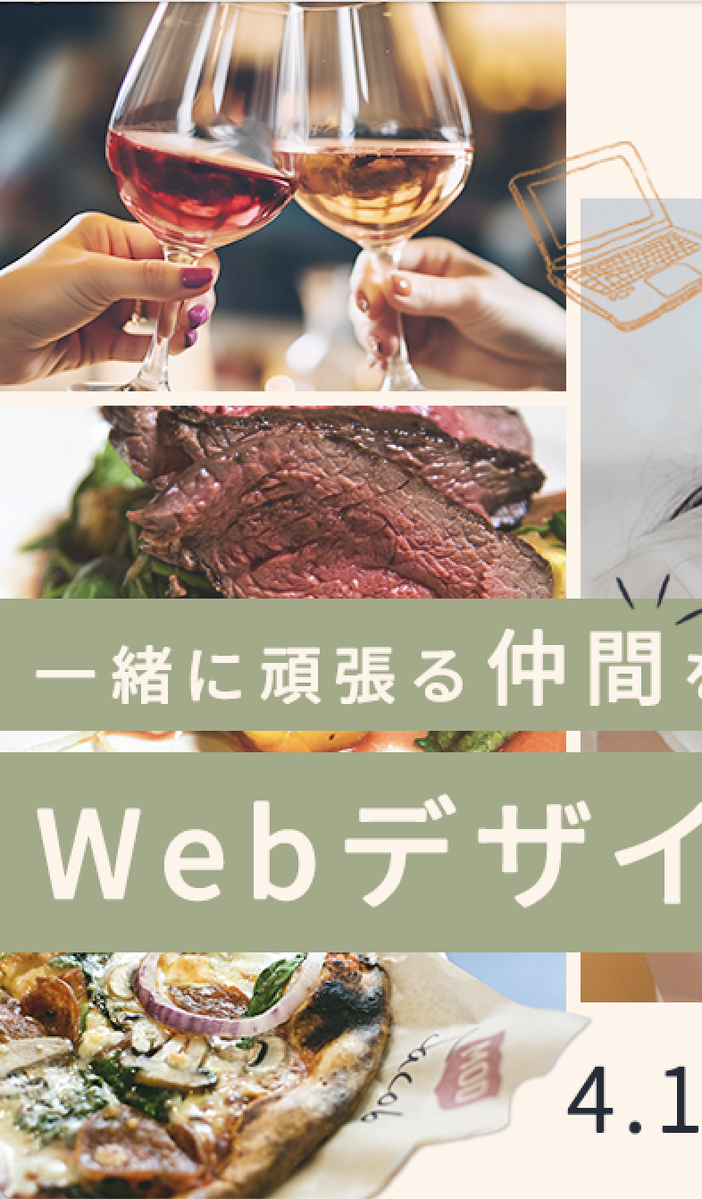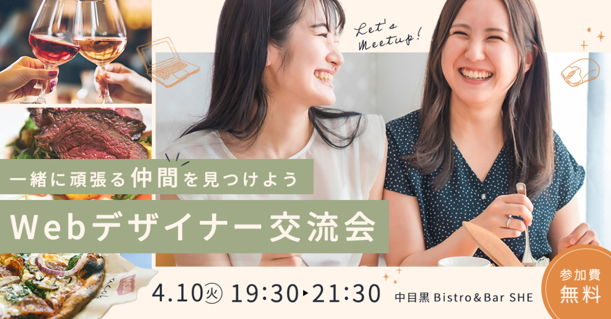 - 「Webデザイナー交流会」という内容が伝わりやすいよう、文字の大きさを大きくし、背景に帯を敷いて目立たせました。位置は、Z型の視線誘導を意識し、女性の写真の次に、「一種に頑張る仲間を見つけよう」というフレーズと共に目に入る位置にしました。