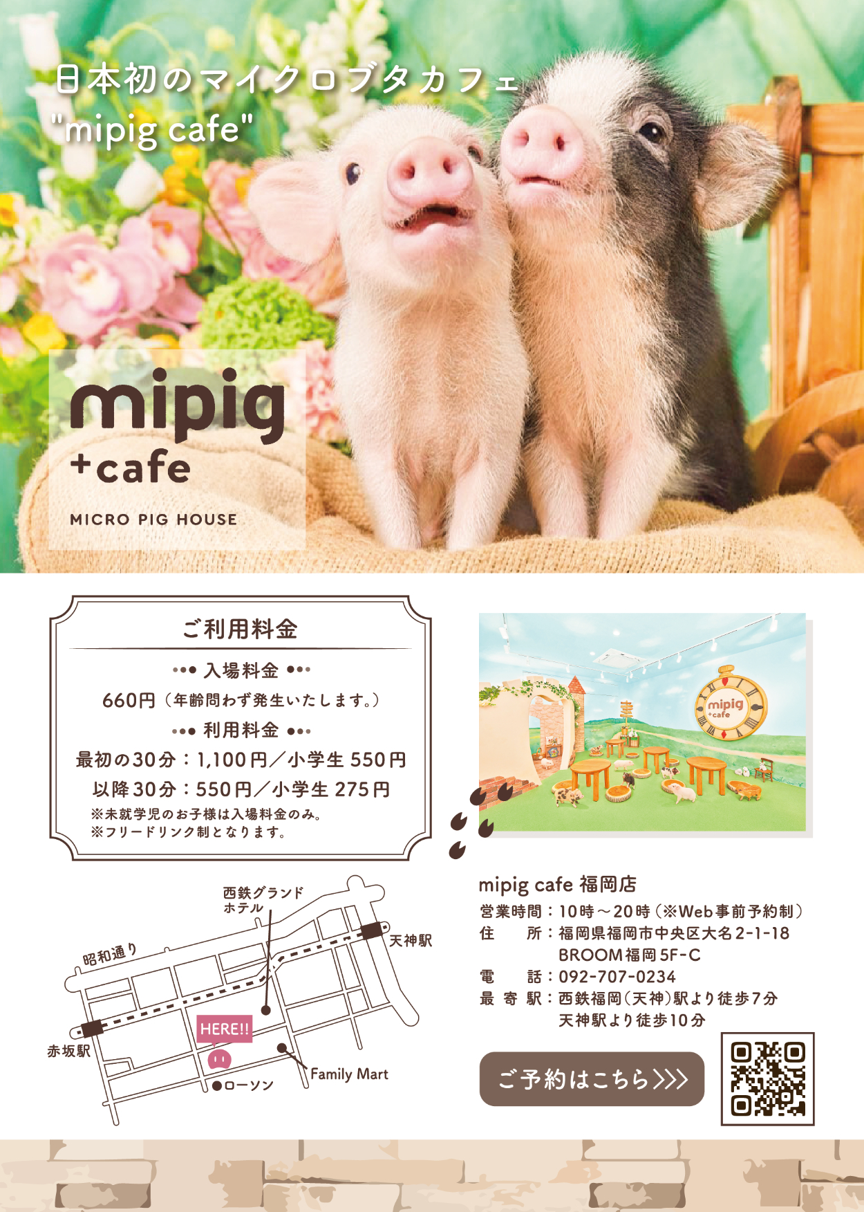 マイクロブタさんと触れ合うことができる「mipig cafe」福岡店のチラシコンペに応募した作品です。優秀賞を受賞しました。