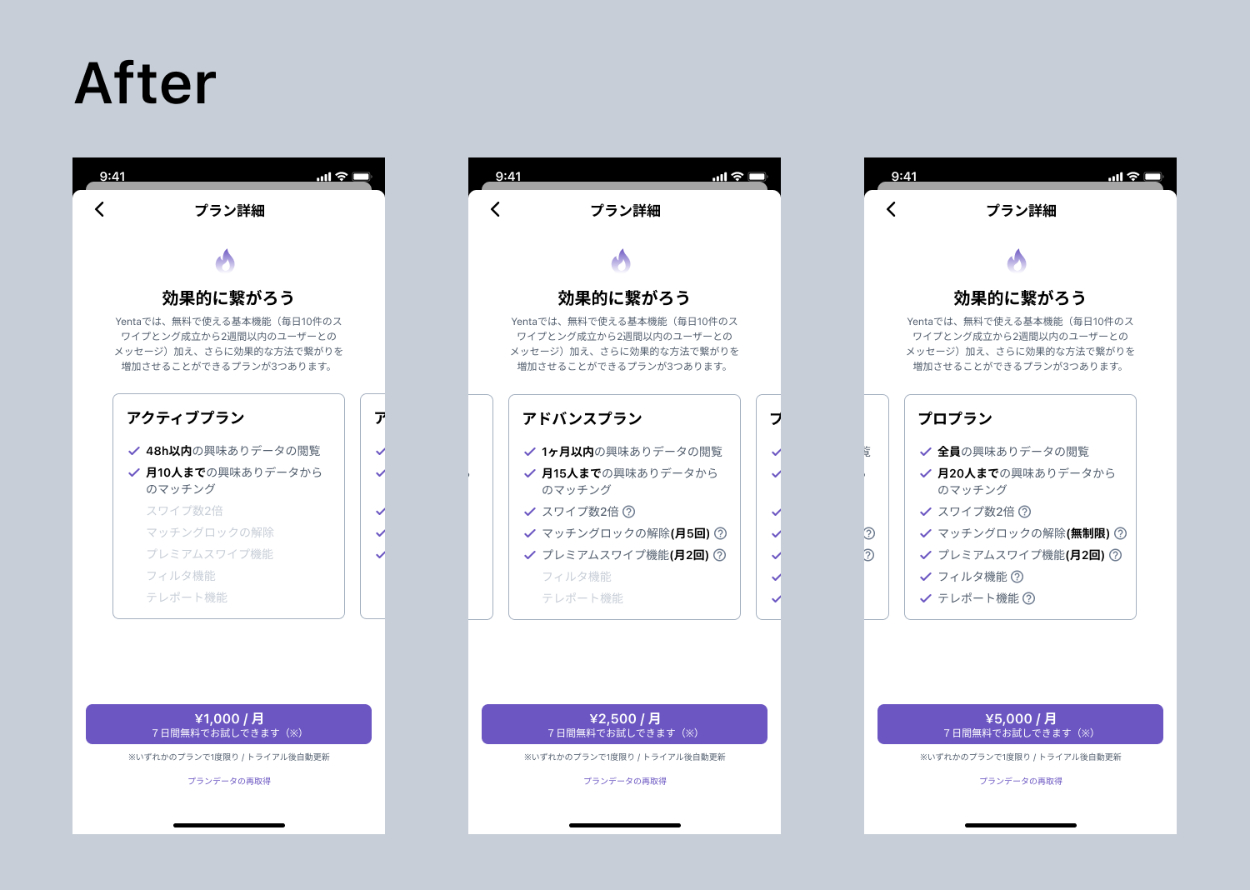 結論、最終的にBeforeのプラン説明画面とAfterのプラン説明画面をA/Bテストした結果、Afterの課金プラン説明画面からの課金率はBeforeのプラン説明画面に比べて6%高区なりました。