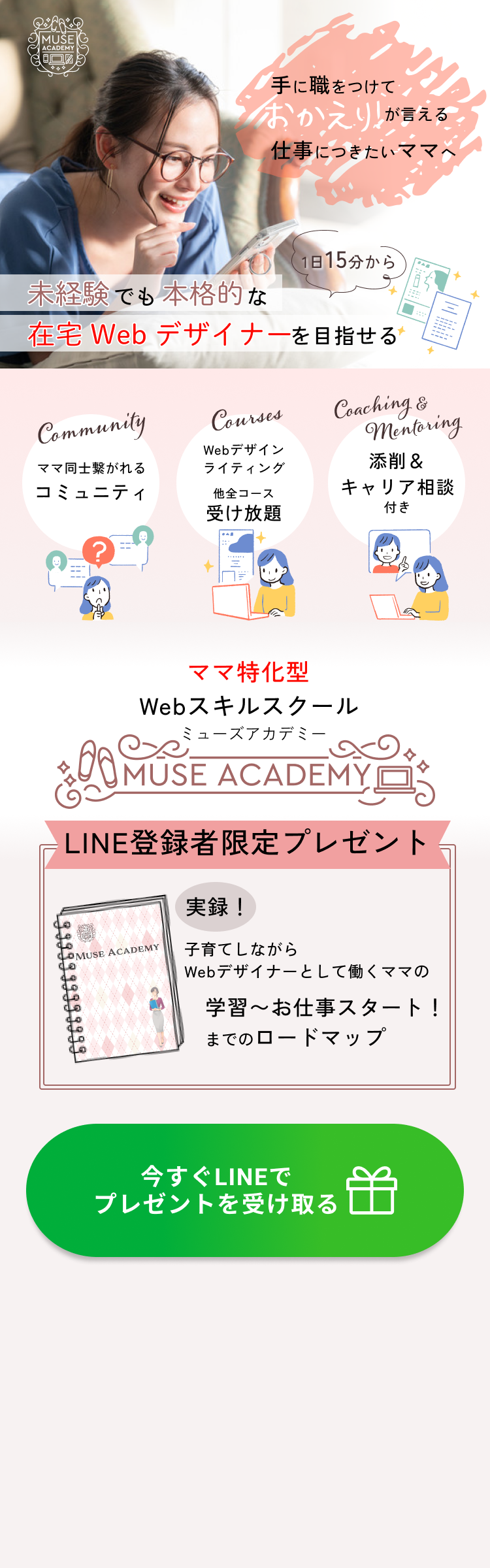 ミューズアカデミーLP まみほ フリーランスWebデザイナー OVERVIEW ママ専用のオンラインスクール「ミューズアカデミー」のLPコンペに参加。 採用はされませんでしたが、優秀賞をいただきました。 YEAR 2021