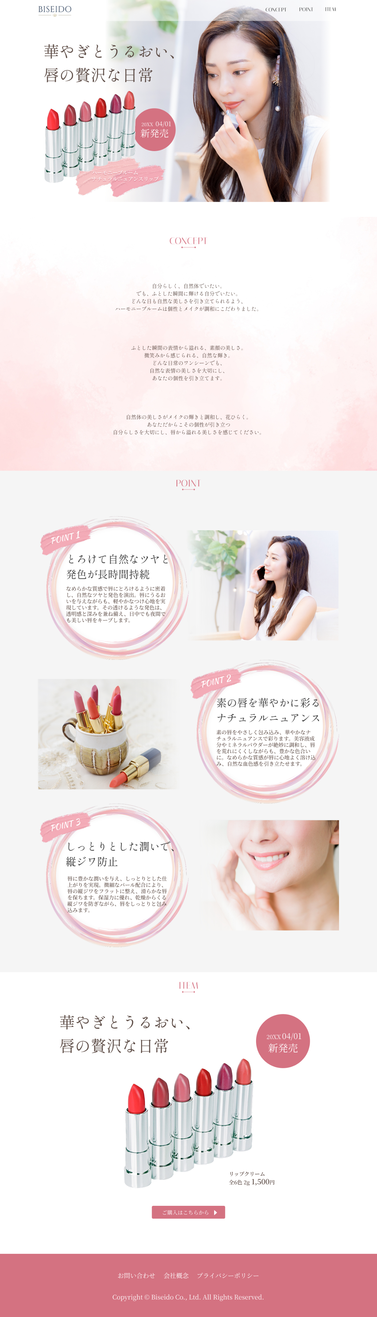 LPデザインカンプ|リップクリーム(架空案件) nanami Webデザイナー OVERVIEW Webデザインスクール「HerTech」の課題により、架空の依頼書を元にリップクリームのデザインカンプを制作しました。