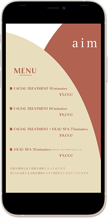 大阪にある美容院 C's池田店に併設されているフェイシャルエステ&ヘッドスパサロン aim 様のメニュー表の企画・デザインを行いました