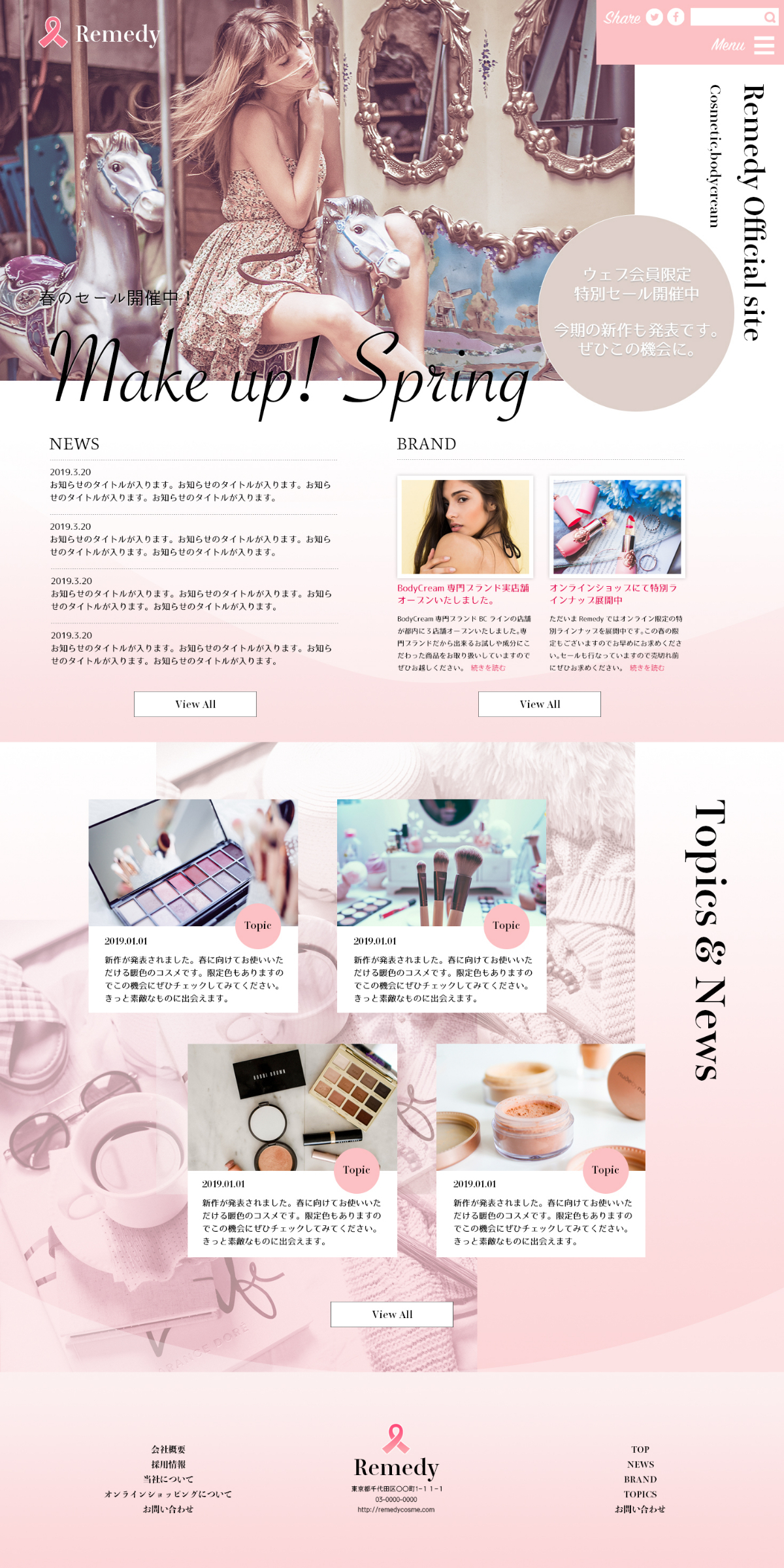 架空のコスメブランドサイト yui WEBデザイナー/エンジニア志望 OVERVIEW 架空のコスメブランドを制作しました。 制作環境:Mac/Photoshop CC 2019 制作時間:約4時間 YEAR 2019