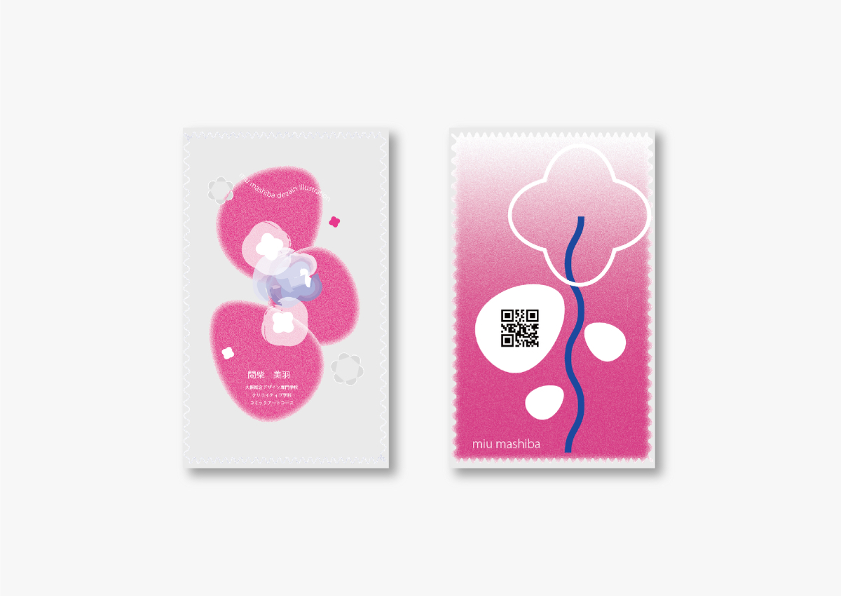 名刺デザイン(自主制作) 間柴 美羽 OVERVIEW 自身の名刺をデザインしました。 ◎ モチーフ・・・ピンクの花◎ ポイント・・・花のモチーフを連想させるように意識した。可愛らしい雰囲気を作るために全体的に丸みを意識した。シンプルでありつつもデザイン性を出せるように意識した。◎ 制作時間・・・3時間◎ 使用ツール・・・Illustrator / Photoshop
