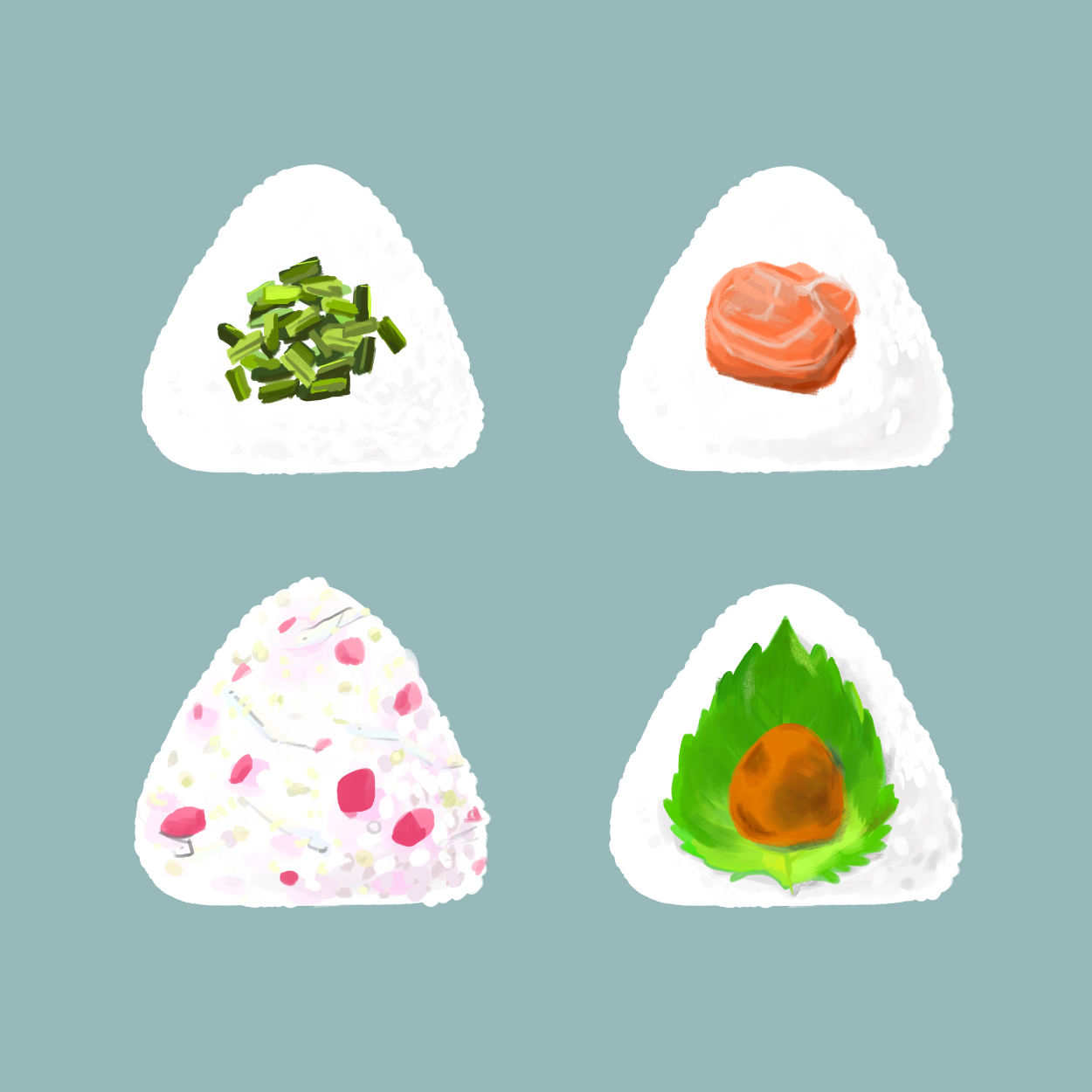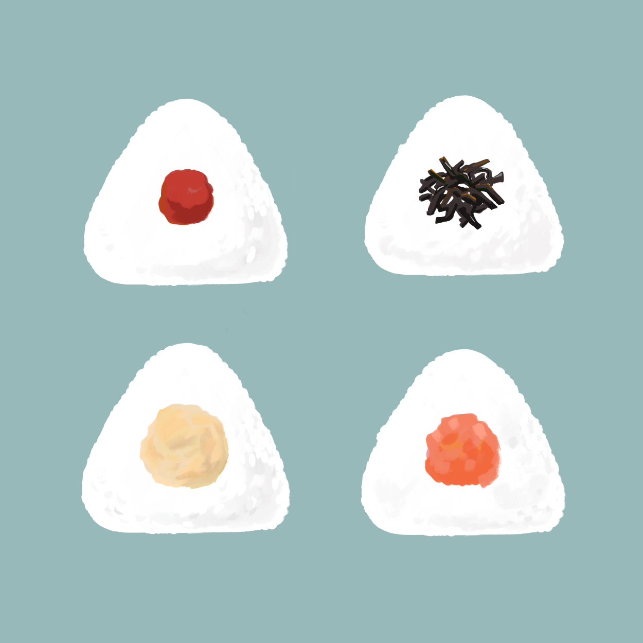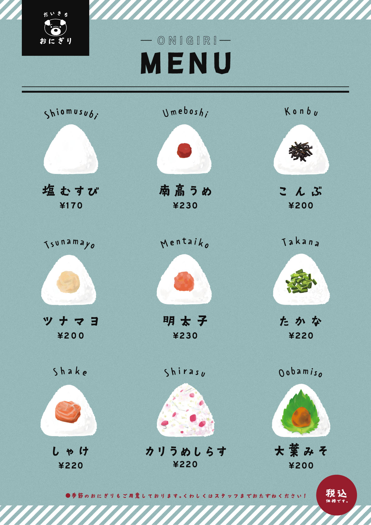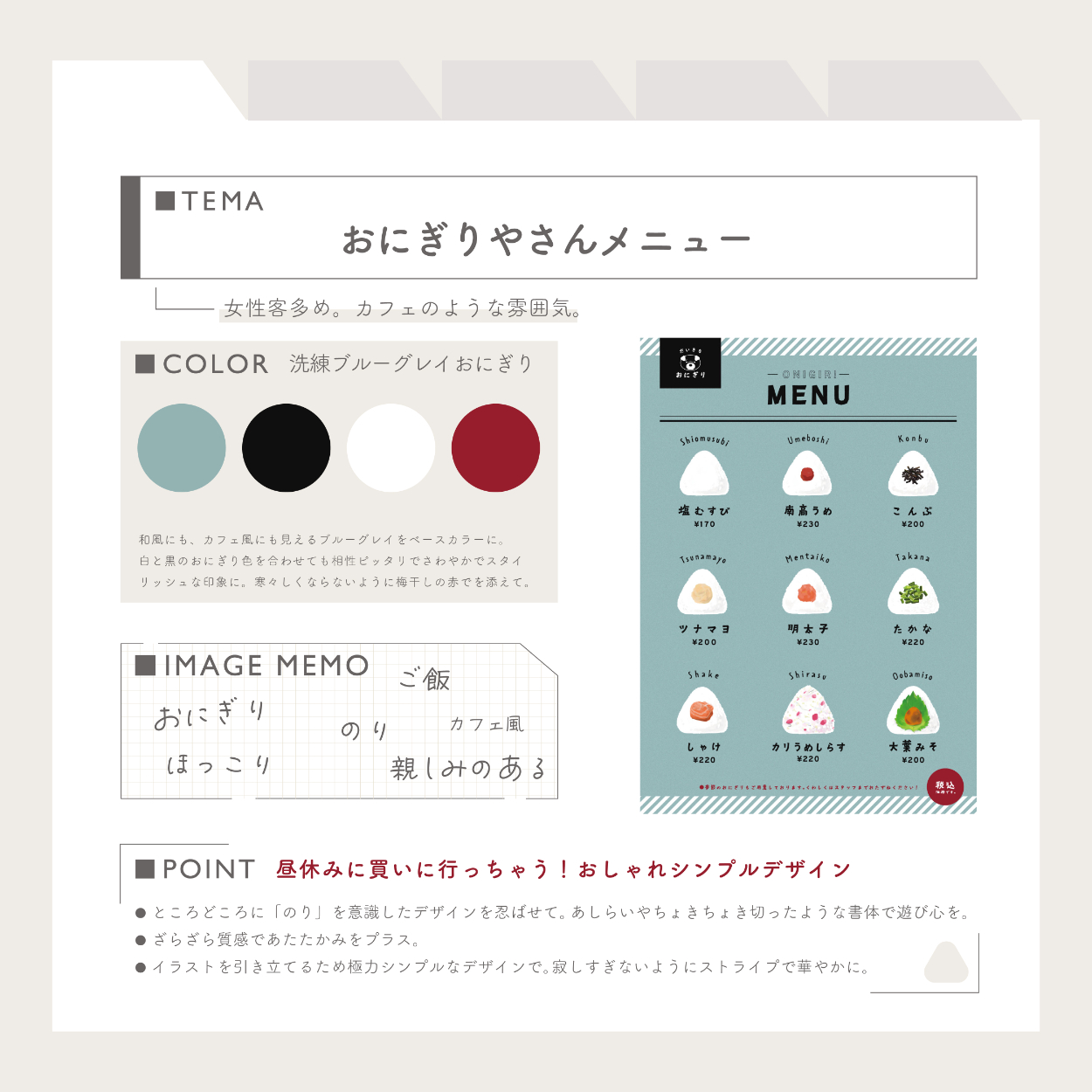 【自主制作】おにぎり屋さんメニュー(イラスト&デザイン) KEIKO UEDA デザイナー/イラストレーター OVERVIEW OVERVIEW 2024.7.17/制作時間:9時間/制作ツール:illustrator,adobefresco/コンセプト:カフェ風シンプル手作りおにぎりデザイン YEAR 2024