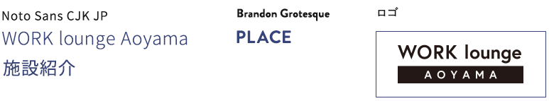 WORK lounge Aoyamaのロゴに合うようなフォントを2種類。和文と欧文でフォントを 変えました。フォントで「清潔感」や「安心感」を表現。太さを使い分けることにで 「女性らしさ」と「力強さ」を表現。