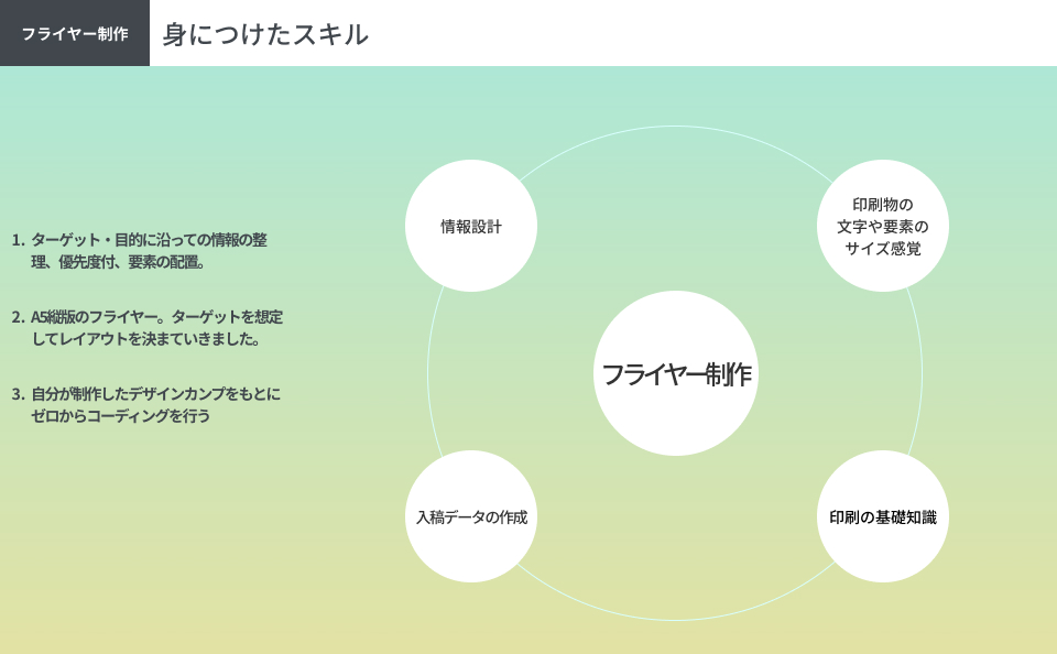SHElikes MULTI CREATOR で、フライヤー制作課題に取り組みました。ペルソナ設定から入稿データ作成まで行いました。 【制作時間】25時間 【ツール】Illustrator