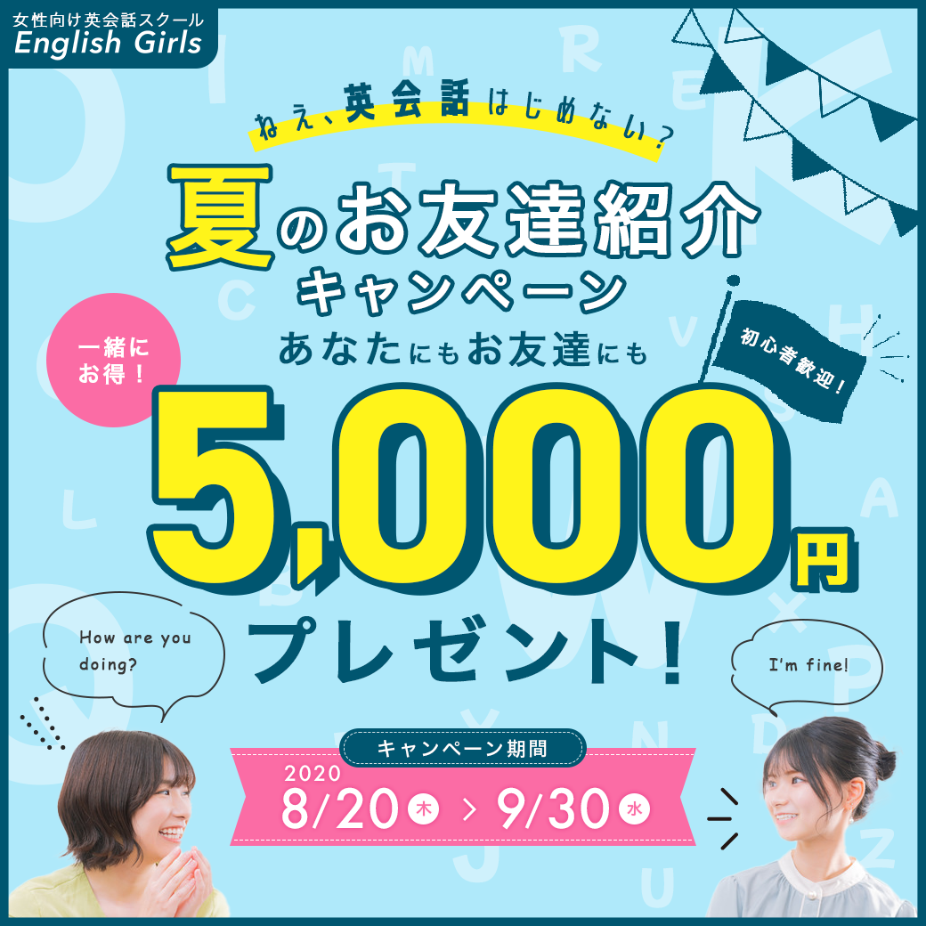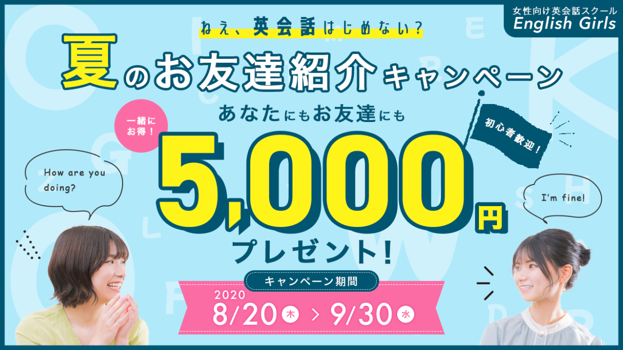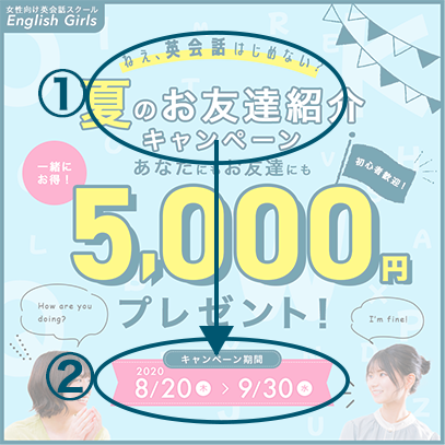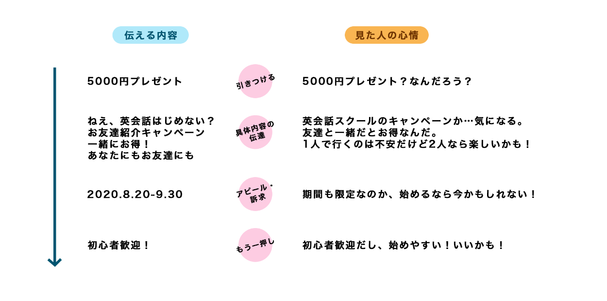 ターゲットを惹きつけるために一番目立たせたい「5000円」を大きく真ん中に配置しました。上部に「ねえ、英会話はじめない?」の言葉と左右下隅に向かい合っている女性、および英語の吹き出しを配置して、「英会話スクール」と「あなたとお友達」を表現しました。また、「5000円」で引きつけたあとは①から②に目線が動くように、「夏」の文字色を黄色にしてフォントサイズを大きくたり、「ねえ、英会話はじめない?」に黄色い下線を引き情報を目立たせました。そのあとはキャンペーン期間にアクセントカラーを敷いて最後まで読んでもらえるように工夫しました。