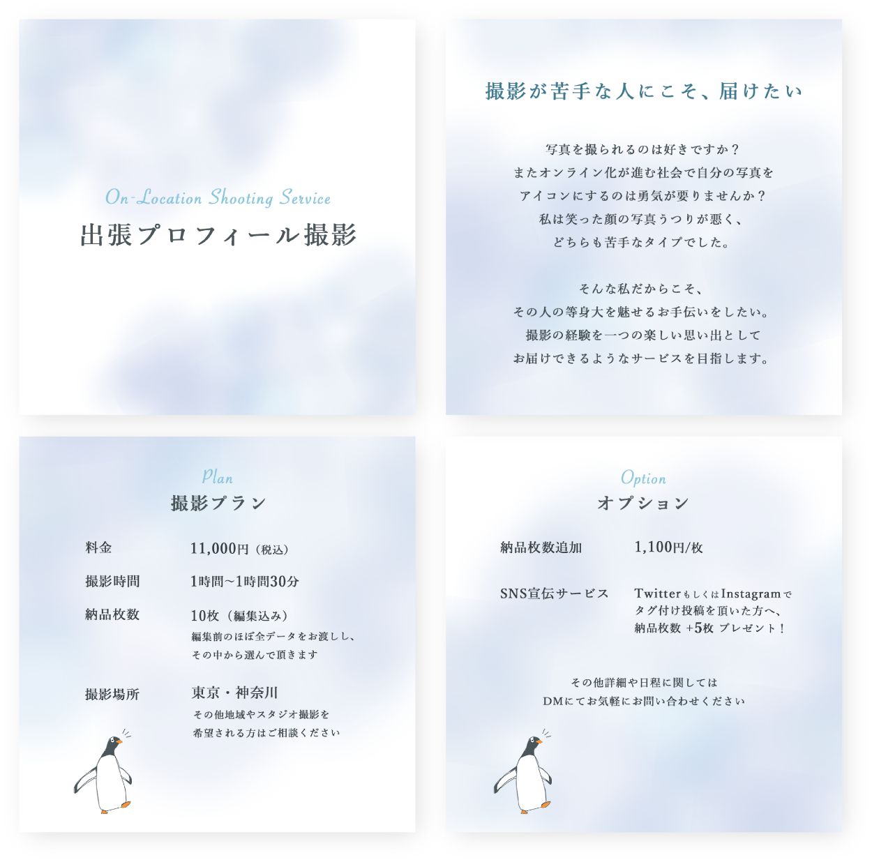 制作目的▶︎出張プロフィール写真撮影サービスのリリースに際して、コンセプトやサービス内容を知っていただく。InstagramとTwitterにバナーを固定し、どのSNSからでもご依頼いただけるようにする。