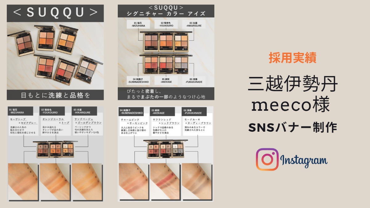 【採用実績】三越伊勢丹meeco様 SNSバナー制作(計4枚) やましー WEBデザイン OVERVIEW 公式Instagramのバナー制作を行いました。 [工夫した点]ブランドイメージ(黒を主に大人っぽい感じ)に合わせて制作しました。商品写真を大きく配置(2枚目→アイシャドウパレット 3、4枚目→スウォッチ画像)し、情報の優先順位を明確にしました。